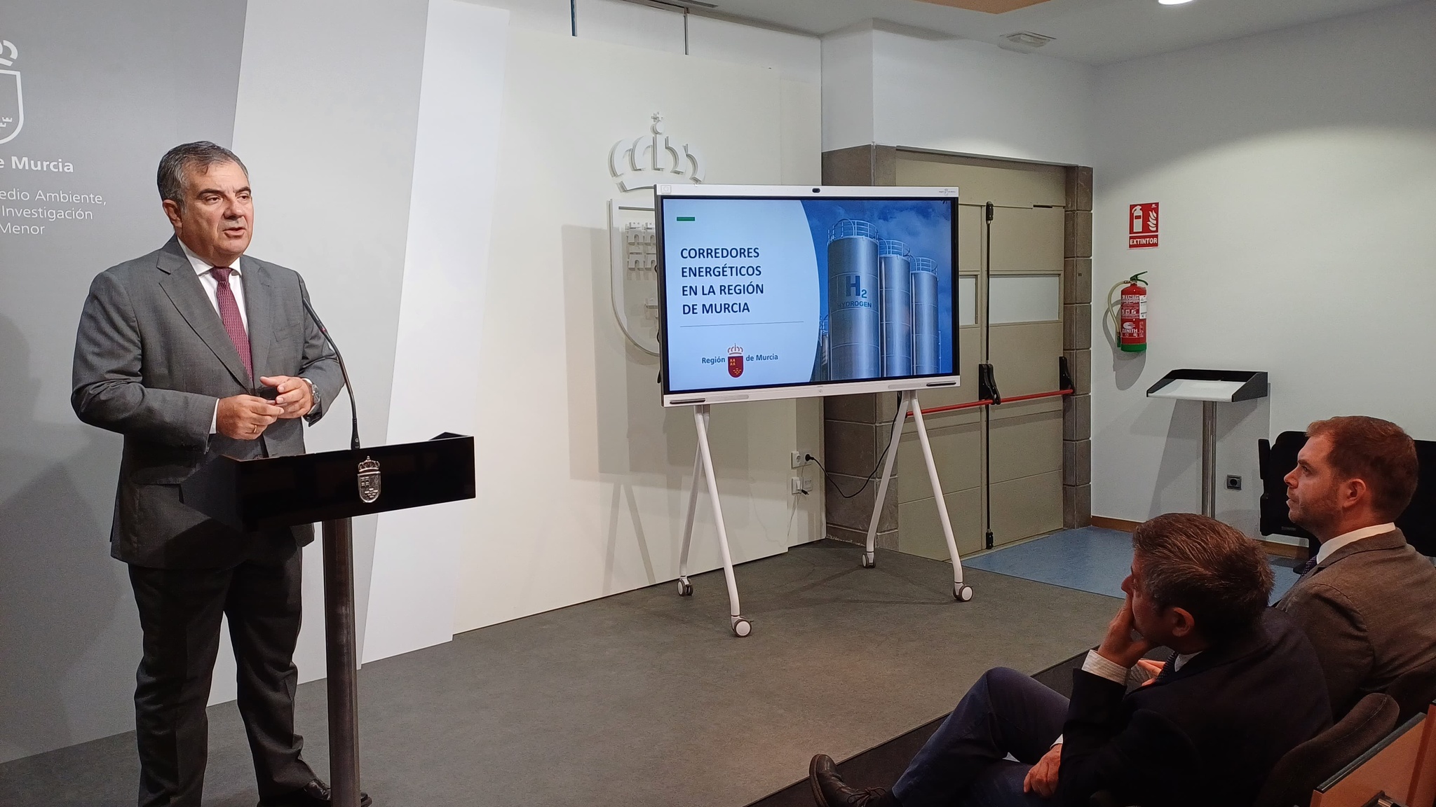 El consejero de Medio Ambiente, Universidades, Investigación y Mar Menor, Juan María Vázquez, explica los detalles de los corredores energéticos que la Región necesita para el crecimiento industrial y avanzar en la descarbonización y que propone al Ministerio para la Transición Ecológica y el Reto Demográfico.