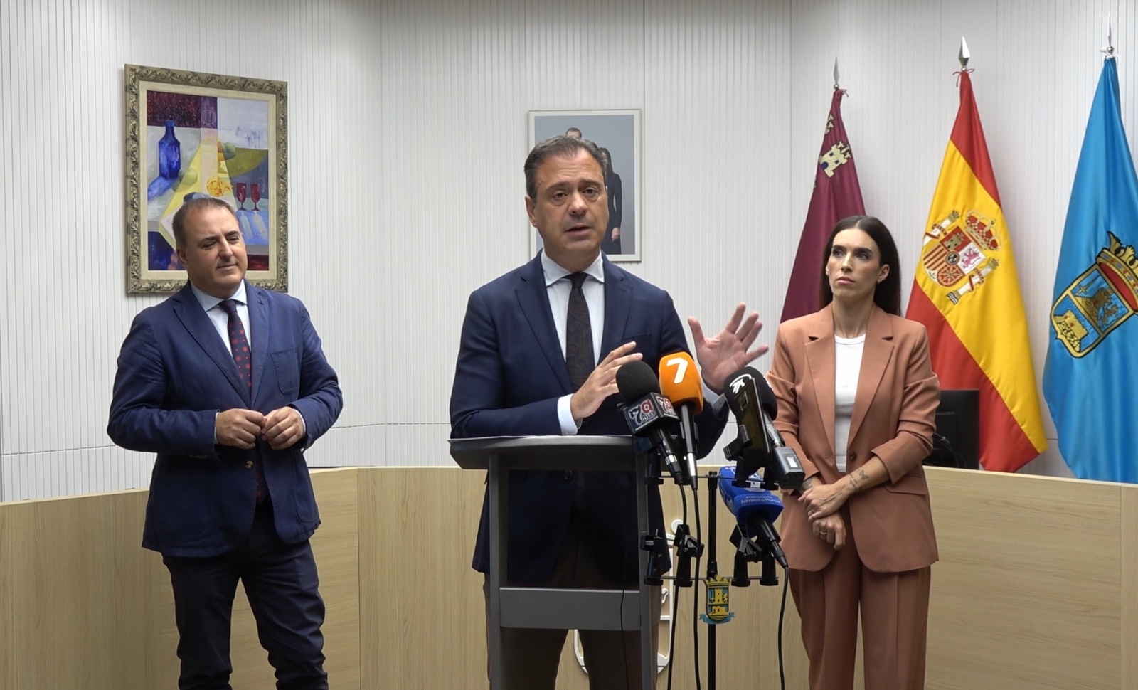 El consejero de Presidencia, Portavocía, Acción Exterior y Emergencia, Marcos Ortuño, interviene en presencia de la alcaldesa de Alhama de Murcia, María Cánovas, y del director general de Administración Local, Francisco Abril