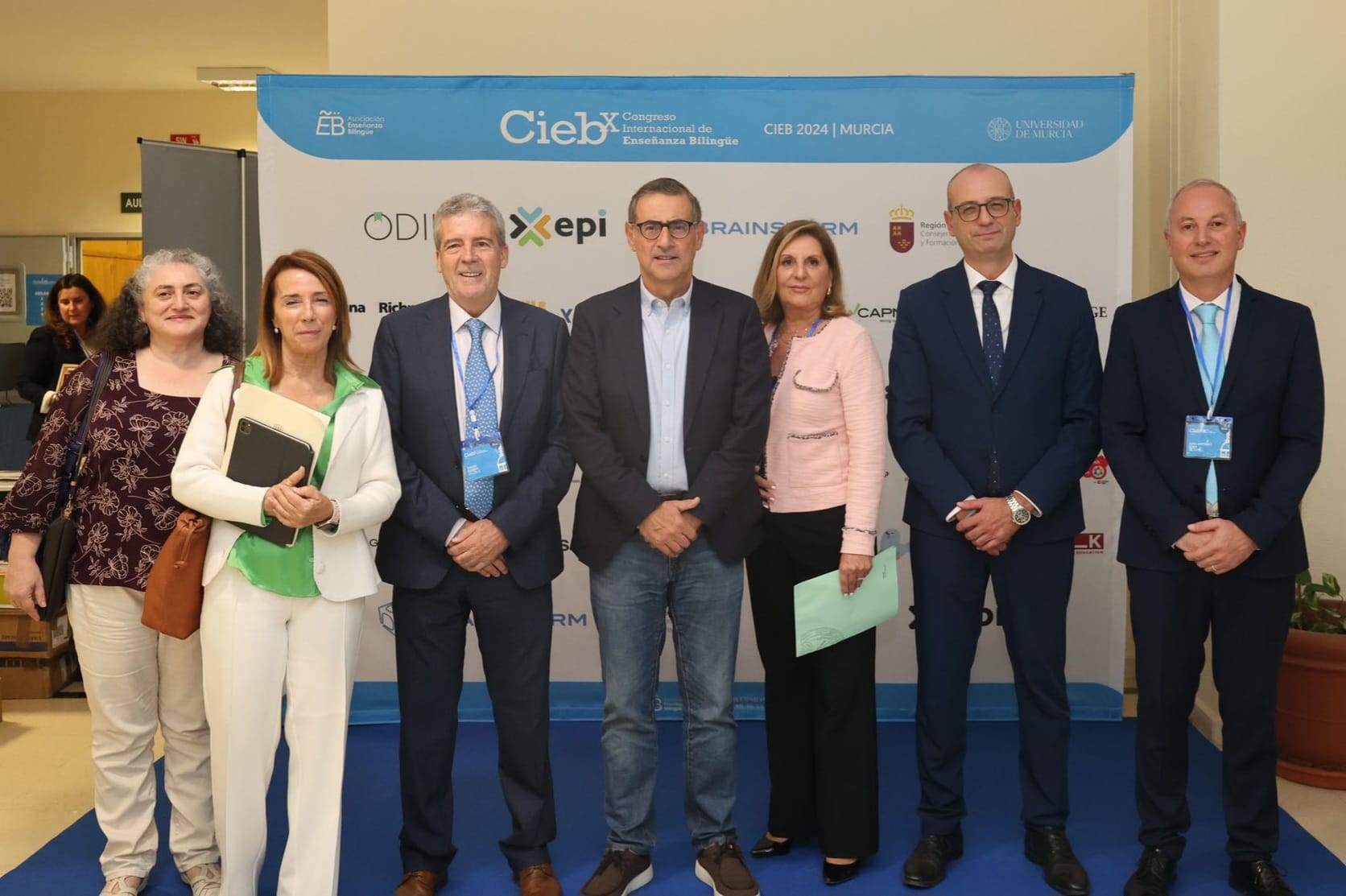 El consejero de Educación y Formación Profesional, Víctor Marín, participó hoy en la inauguración del X Congreso Internacional de Enseñanza Bilingüe en Centros Educativos CIEB-2024, y destacó que “según el último informe del Ministerio de Educación, la Región es la comunidad en la que más alumnos participan en Primaria en experiencias de utilización de lenguas extranjeras como lengua de enseñanza, en el curso 2022-2023, con un 93,7 por ciento del alumnado, mientras que la media nacional es del 42,1 por ciento. En Secundaria, el alumnado de la Región ocupa el segundo puesto, con un 48 por ciento, mientras que la media nacional es del 31,4 por ciento”.