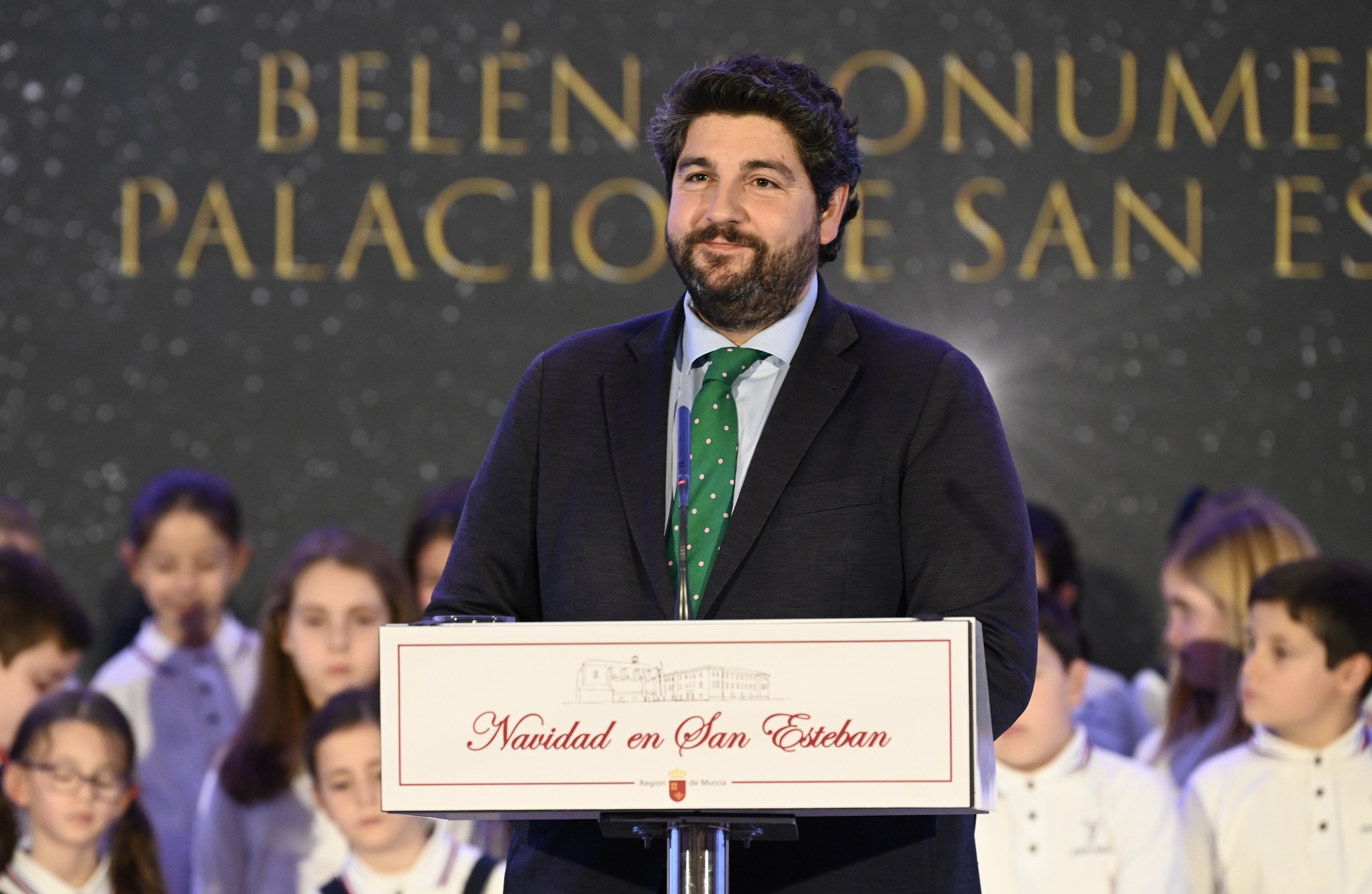 El presidente de la Región de Murcia, Fernando López Miras, inauguró hoy el belén monumental del Palacio de San Esteban, realizado por la Asociación Belenista de Fuente Álamo y la Agrupación Belenista José de Nazaret de La Arboleja (Murcia).