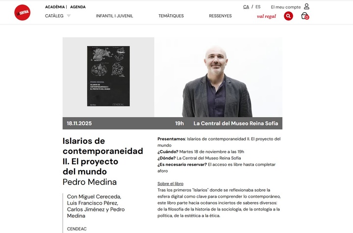 Cartel de la próxima presentación del libro 'Islarios de contemporaneidad II. El proyecto del mundo' de Pedro Medina en La Central del Museo Reina Sofía.