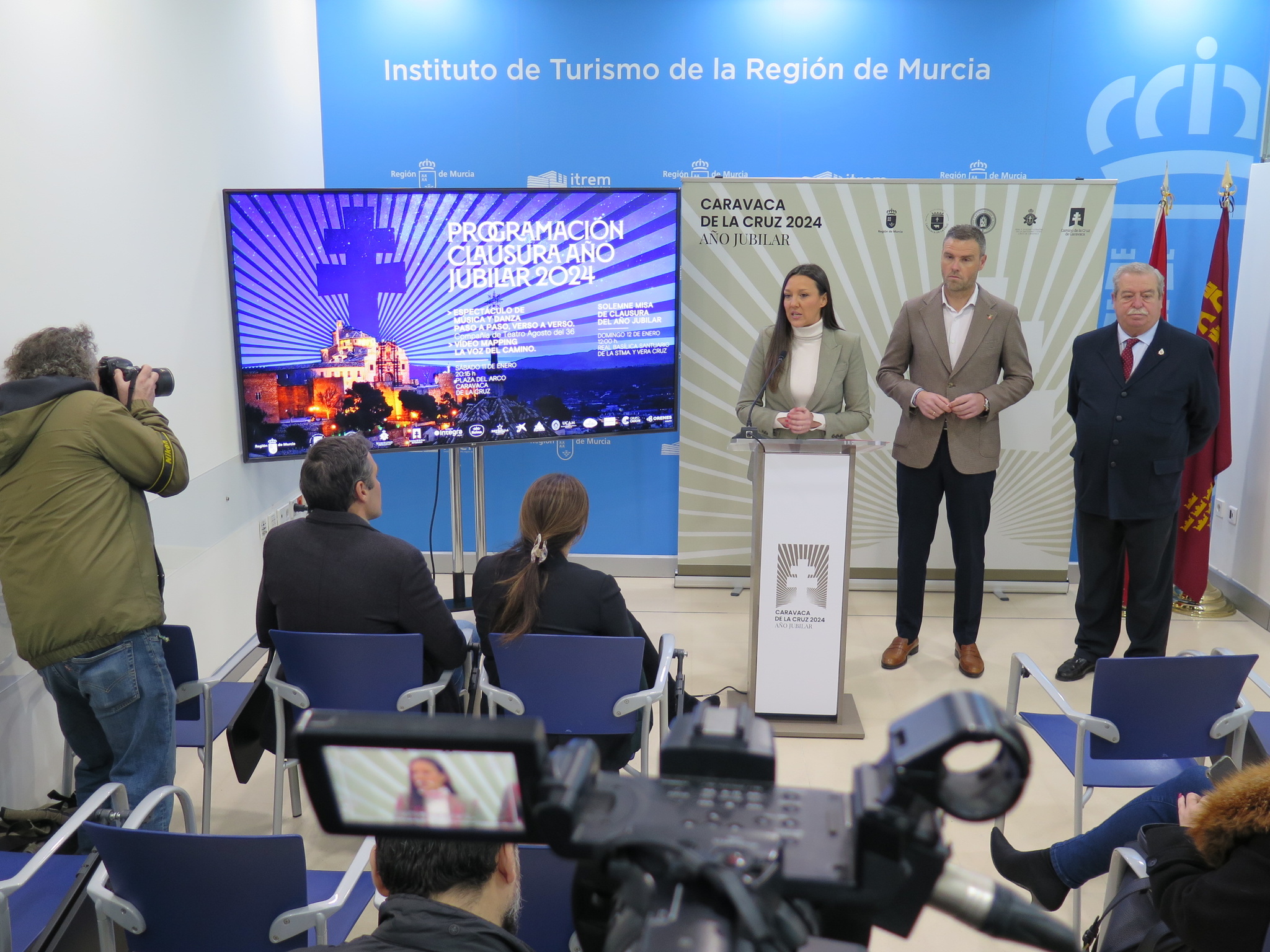La consejera Carmen Conesa durante su intervención, en presencia del alcalde de Caravaca de la Cruz y del hermano mayor de la Cofradía de la Vera Cruz