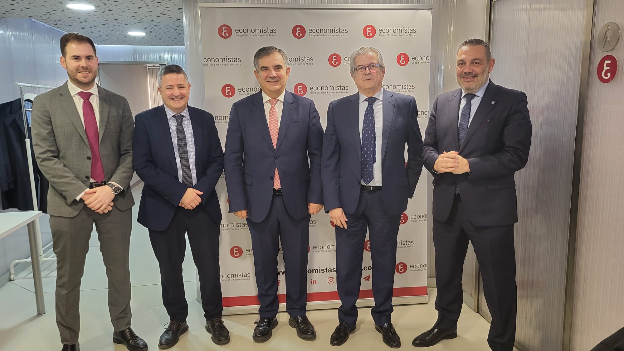 El consejero de Medio Ambiente, Universidades, Investigación y Mar Menor, Juan María Vázquez, con el decano del Colegio de Economistas de la Región de Murcia, Ramón Madrid, y miembros de su Junta Directiva