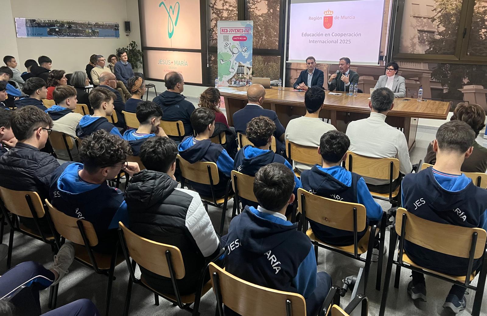 El consejero de Presidencia, Portavocía, Acción Exterior y Emergencias, Marcos Ortuño, acompañado por el director general de Acción Exterior y Cooperación, Juan José Almela, y la directora del colegio Jesús María, Carmen María Fernández, en el acto celebrado esta mañana