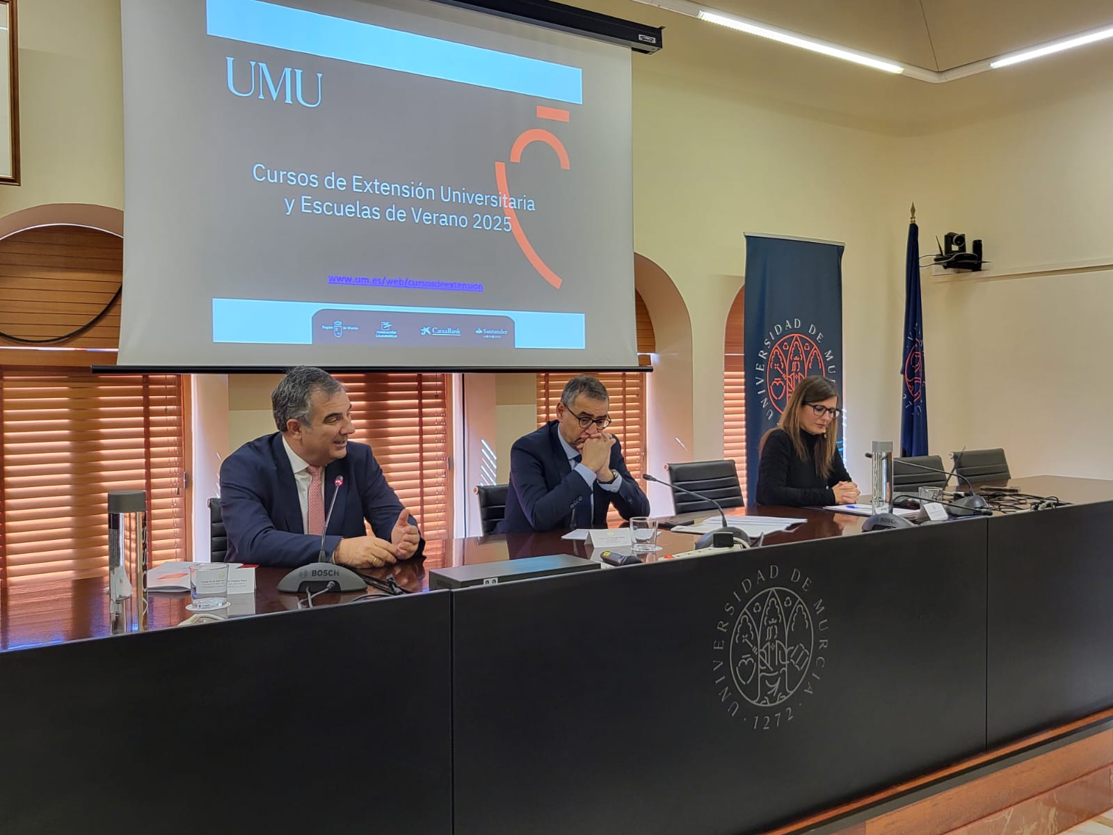 El consejero de Medio Ambiente, Universidades, Investigación y Mar Menor, Juan María Vázquez, junto al rector de la Universidad de Murcia, José Luján, durante la presentación los cursos de 'Extensión Universitaria 2025