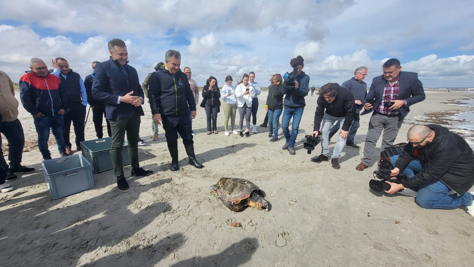 El consejero de Medio Ambiente, Universidades, Investigación y Mar Menor, Juan María Vázquez, junto con el alcalde de San Pedro del Pinatar, libera un ejemplar de más de 30 kilos de peso de tortuga boba en la playa de La Torre Derribada