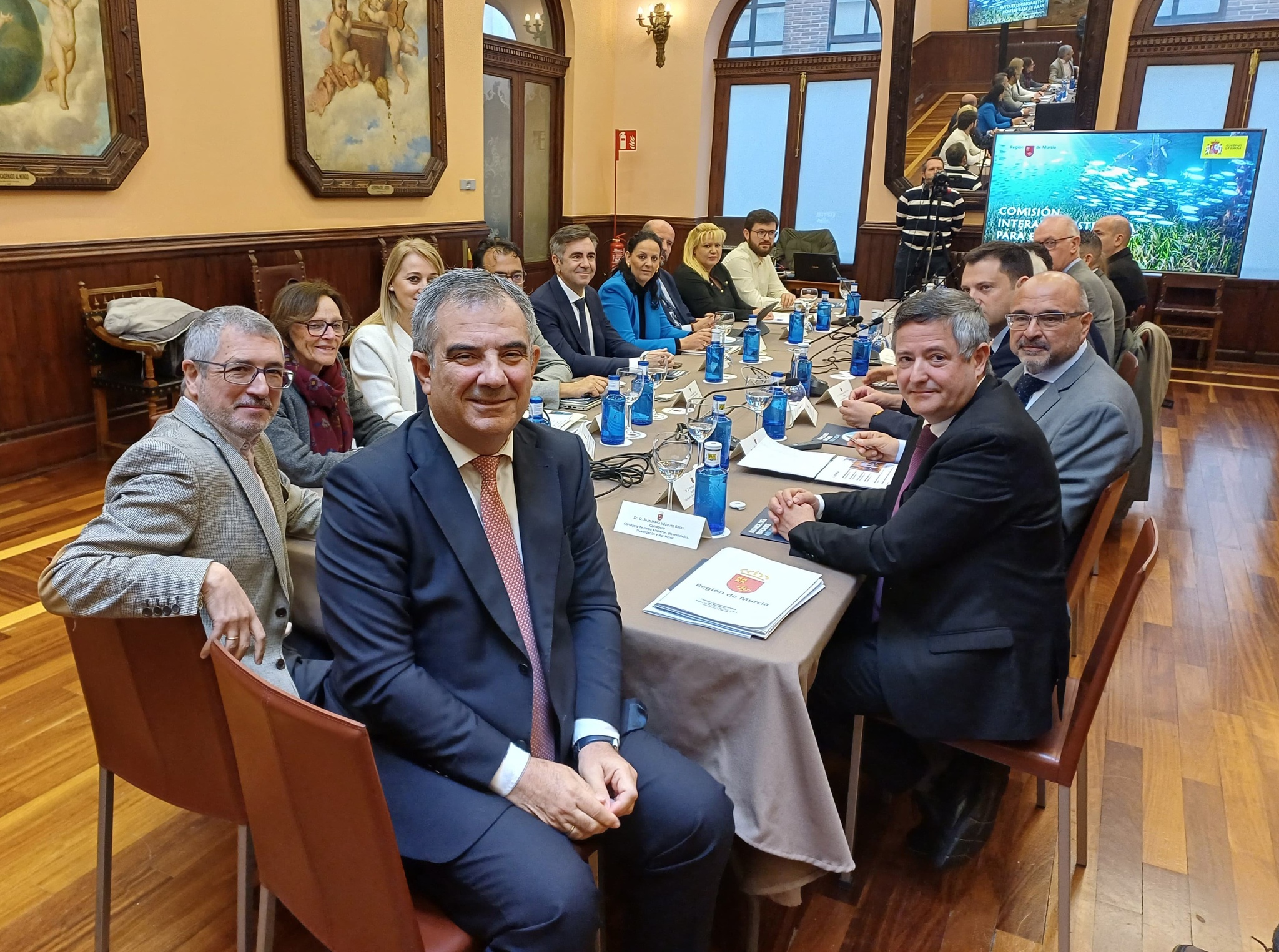 El consejero de Medio Ambiente, Universidades, Investigación y Mar Menor, Juan María Vázquez, que preside la Comisión Interadministrativa del Mar Menor, junto al secretario de estado de Medio Ambiente, Hugo Morán, y el resto de representantes de los municipios de la cuenca vertiente