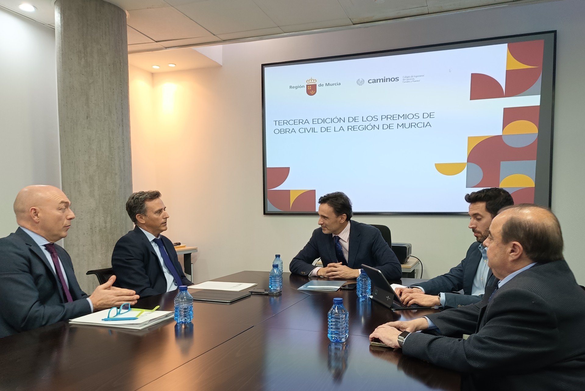 El consejero de Fomento e Infraestructuras, Jorge García Montoro, y el decano del Colegio de Ingenieros de Caminos, Canales y Puertos de la Región de Murcia, Alejandro Lázaro Badenas, durante la firma del convenio de la tercera edición de los Premios de Obra Civil de la Región (2)