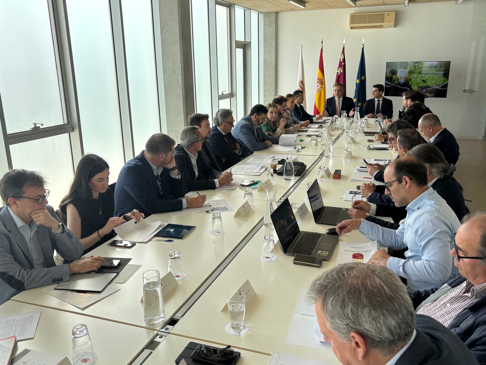 El consejero de Medio Ambiente, Universidades, Investigación y Mar Menor, Juan María Vázquez, junto con el alcalde de Blanca, Ángel Pablo Cano, durante la reunión del grupo de trabajo 'Más Sostenible', para elaborar el Plan Industrial de la Región de Murcia