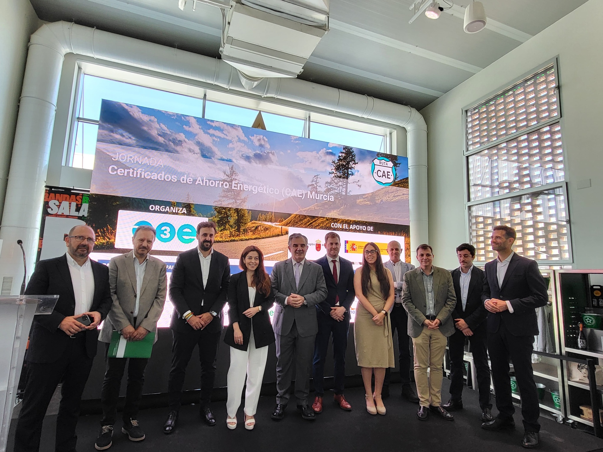 El consejero de Medio Ambiente, Universidades, Investigación y Mar Menor, Juan María Vázquez, junto con el presidente de la Asociación de Empresas de Eficiencia Energética (A3E), Ginés Ángel García , y los participantes en la jornada ’Certificados de Ahorro Energético (CAEs)’.