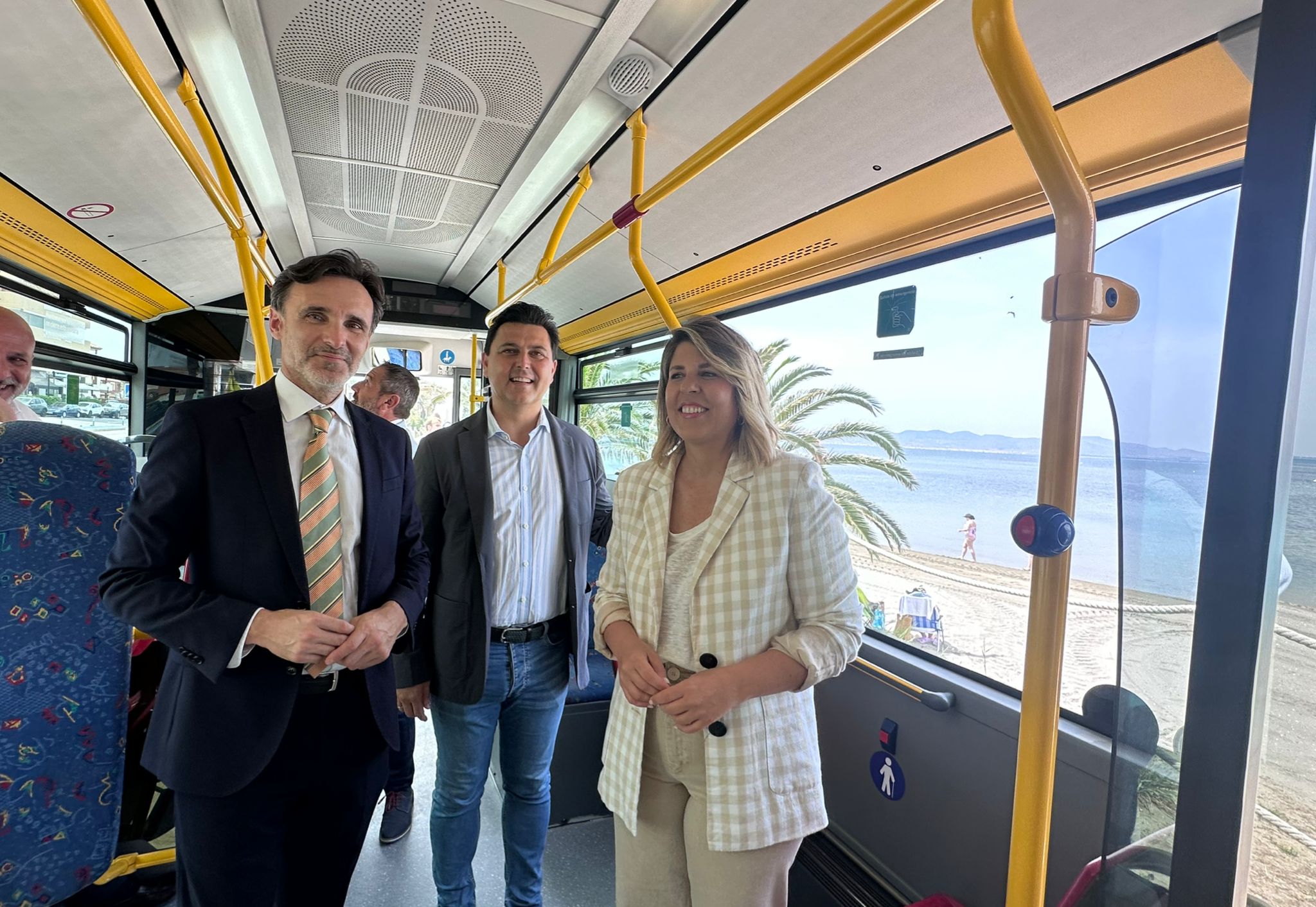 El consejero de Fomento e Infraestructuras, Jorge García Montoro, junto a la alcaldesa de Cartagena, Noelia Arroyo, y el alcalde de San Javier, José Miguel Luengo, en la presentación del refuerzo en el servicio de autobuses de La Manga para este verano