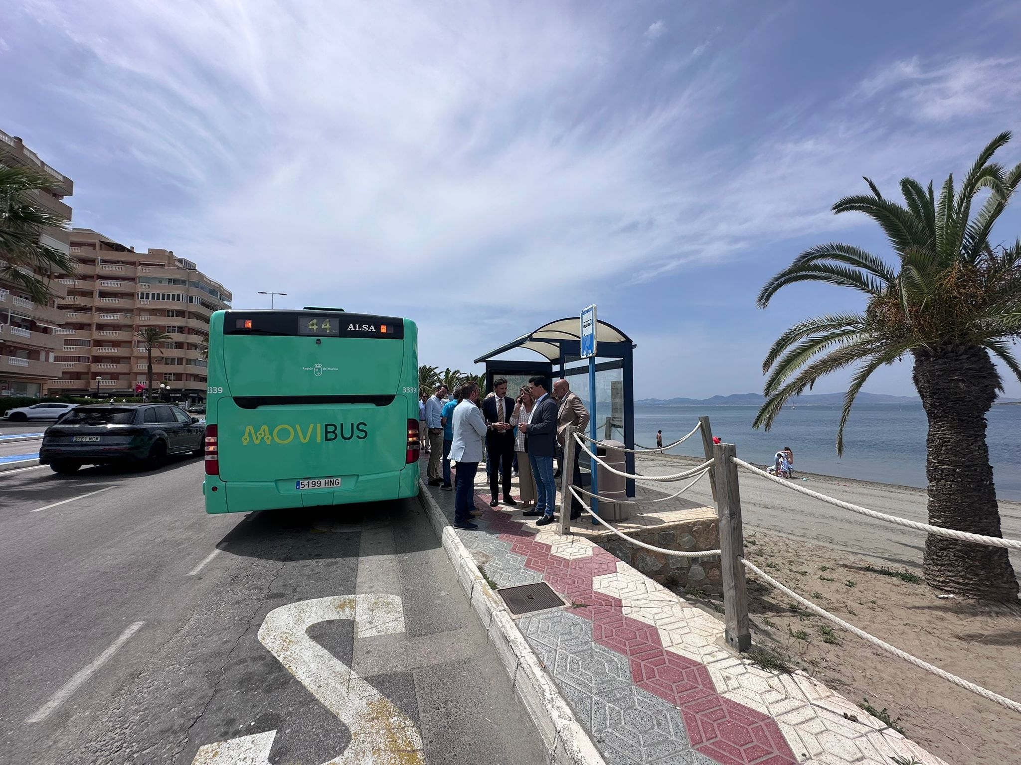 El consejero de Fomento e Infraestructuras, Jorge García Montoro, junto a la alcaldesa de Cartagena, Noelia Arroyo, y el alcalde de San Javier, José Miguel Luengo, en la presentación del refuerzo en el servicio de autobuses de La Manga para este verano (3)