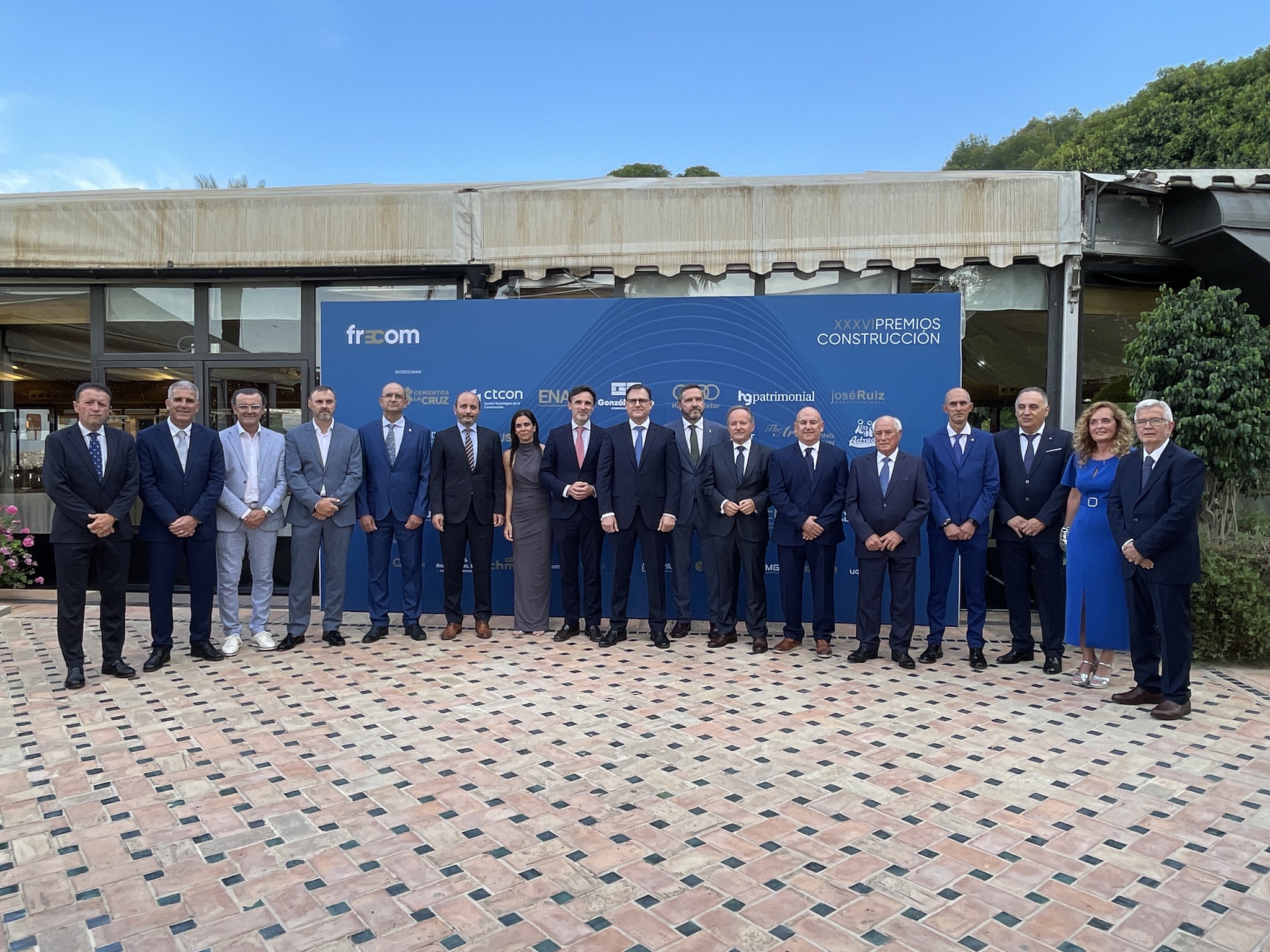 El consejero de Fomento e Infraestructuras, Jorge García Montoro, acompañado del presidente de Frecom, José Hernández, el presidente de Croem, Miguel López Abad, y los premiados en esta edición.