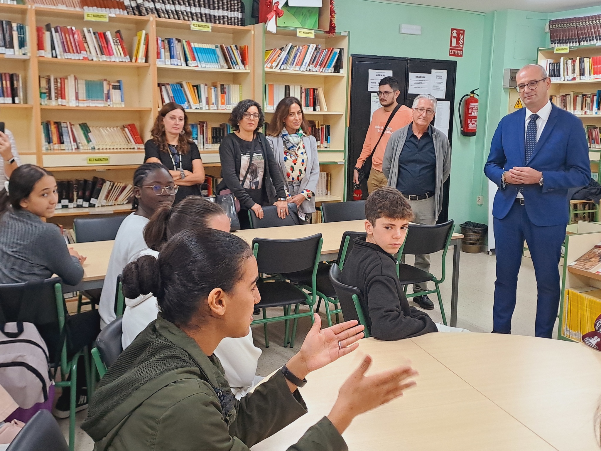 Imagen de archivo de la visita del consejero de Educación y Formación Profesional, Víctor Marín, a los estudiantes del IES Miguel Espinosa que forman parte del proyecto.