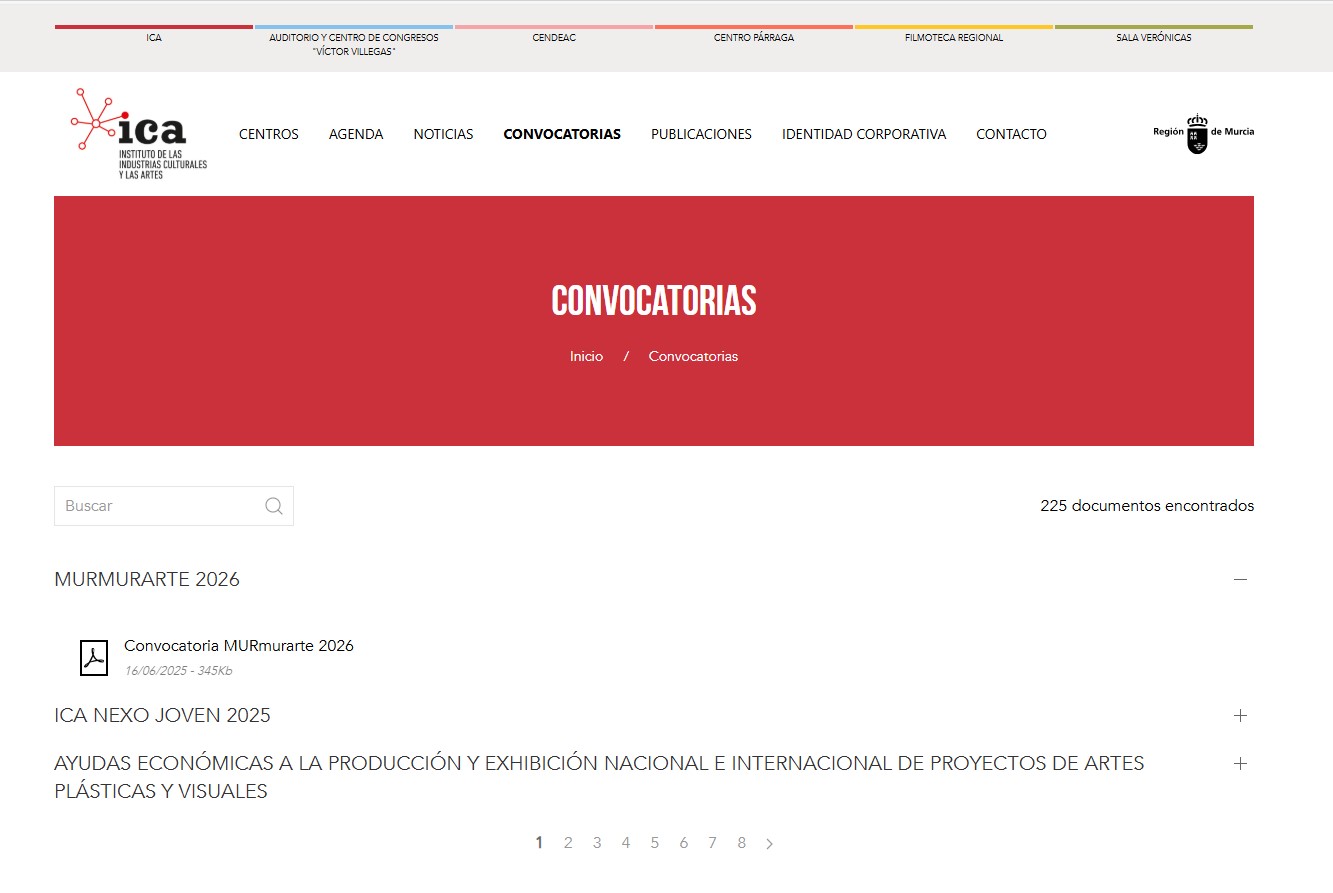 Imagen de la página web del Instituto de las Industrias Culturales y las Artes con la convocatoria del plan 'MURmurarte'