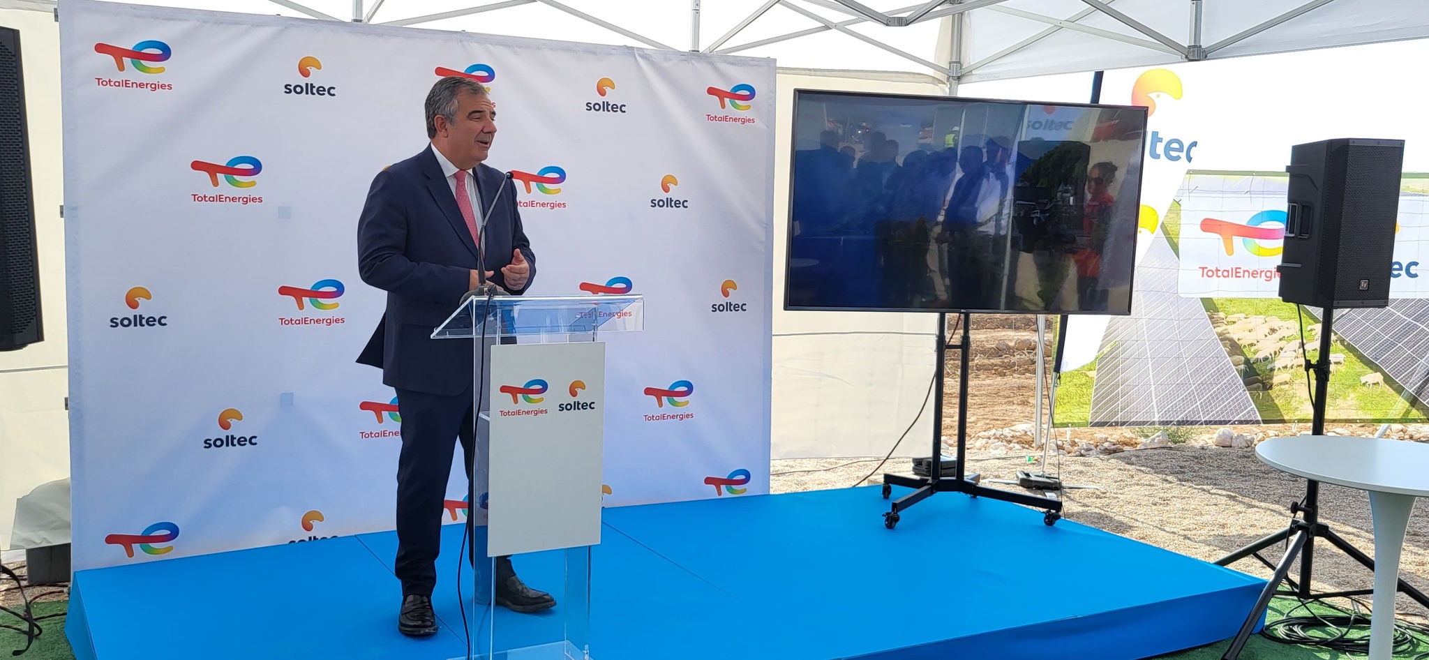 El consejero de Medio Ambiente, Universidades, Investigación y Mar Menor, Juan María Vázquez, durante el acto de colocación de la primera piedra de dos parques solares en la Región, que construirán TotalEnergies y Soltec.
