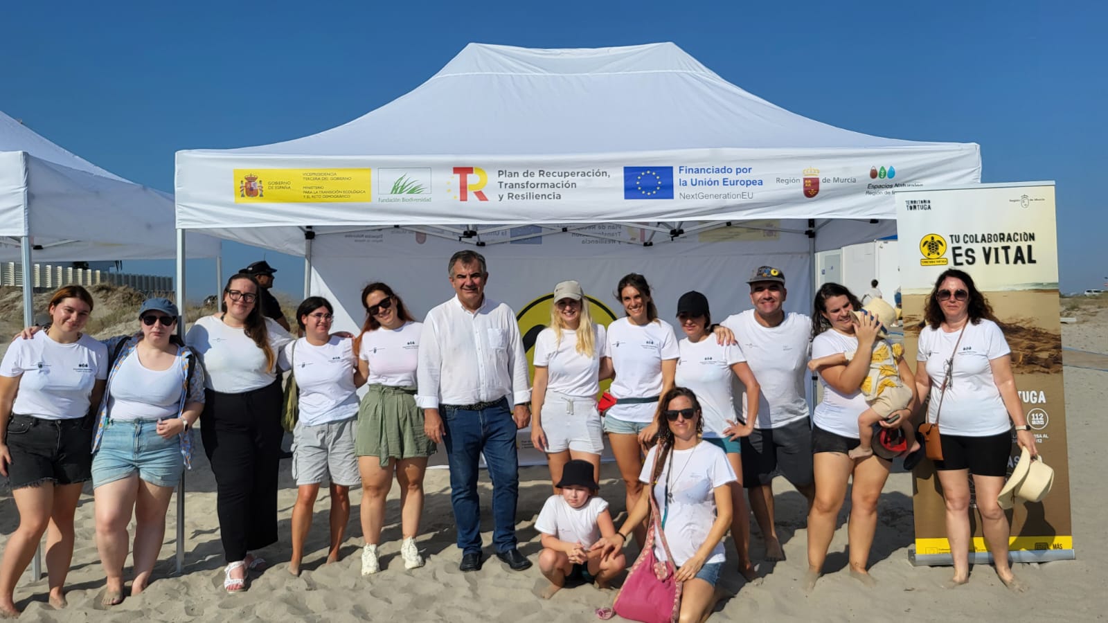 El consejero de Medio Ambiente, Universidades, Investigación y Mar Menor, Juan María Vázquez, junto a jóvenes y voluntarios que han participado en la liberación de ejemplares de tortuga boba en La Manga.