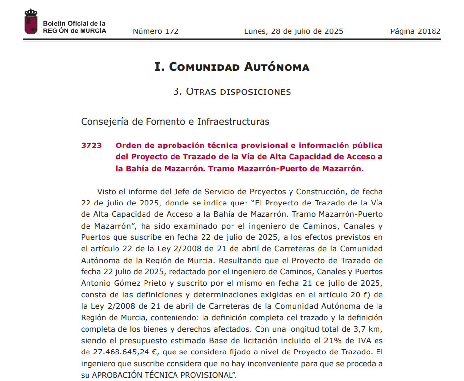 Imagen de la publicación en el BORM del inicio de la exposición pública del trazado de la futura vía de alta capacidad de la bahía de Mazarrón