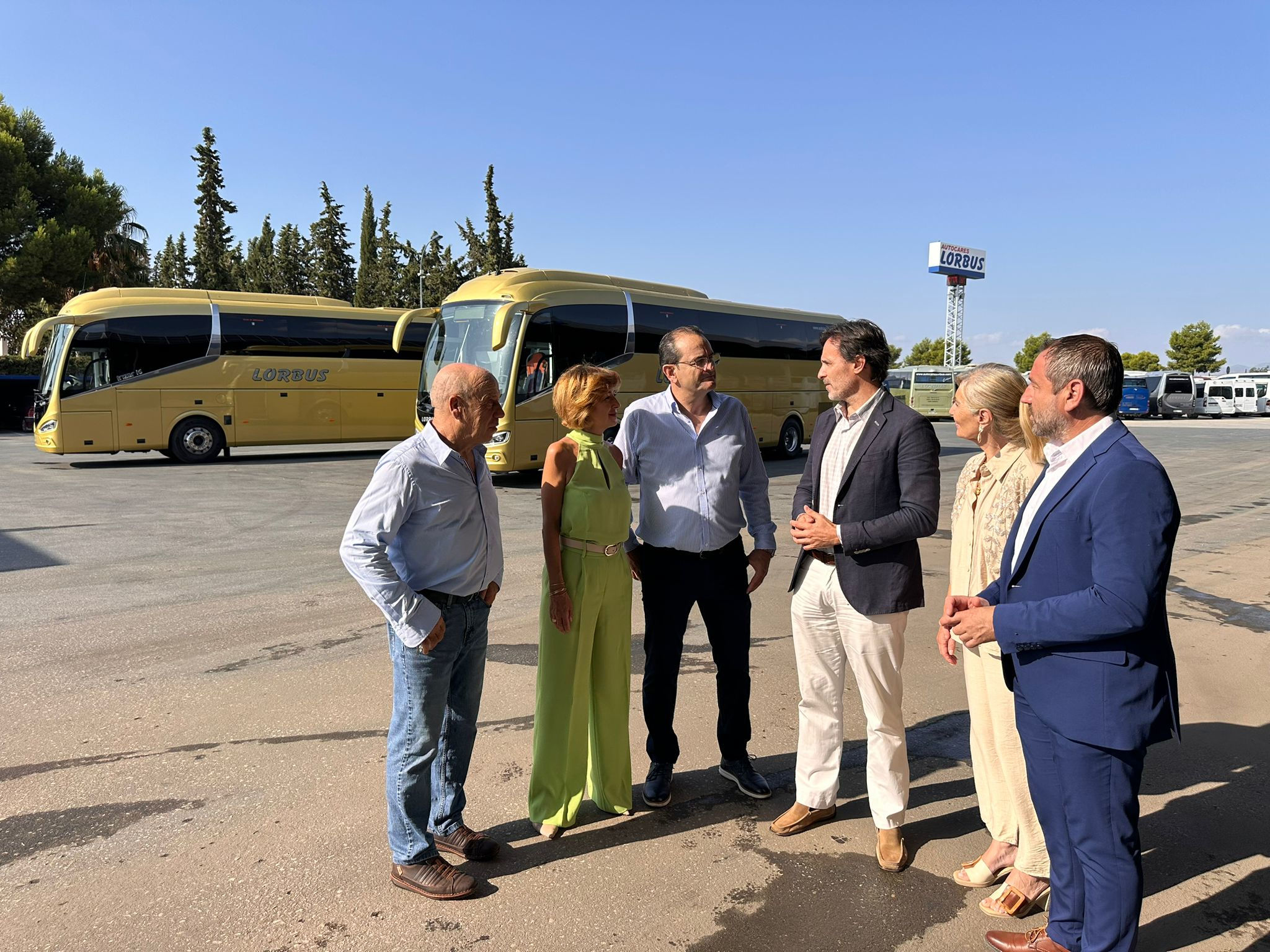 El consejero de Fomento e Infraestructuras, Jorge García Montoro, junto con el director general de Movilidad y Transportes, José Antonio Verdú y los concejales de Lorca Belén Pérez y Carmen Menduiña, visita las instalaciones la empresa lorquina Autocares Lorbus acompañado de sus propietarios.