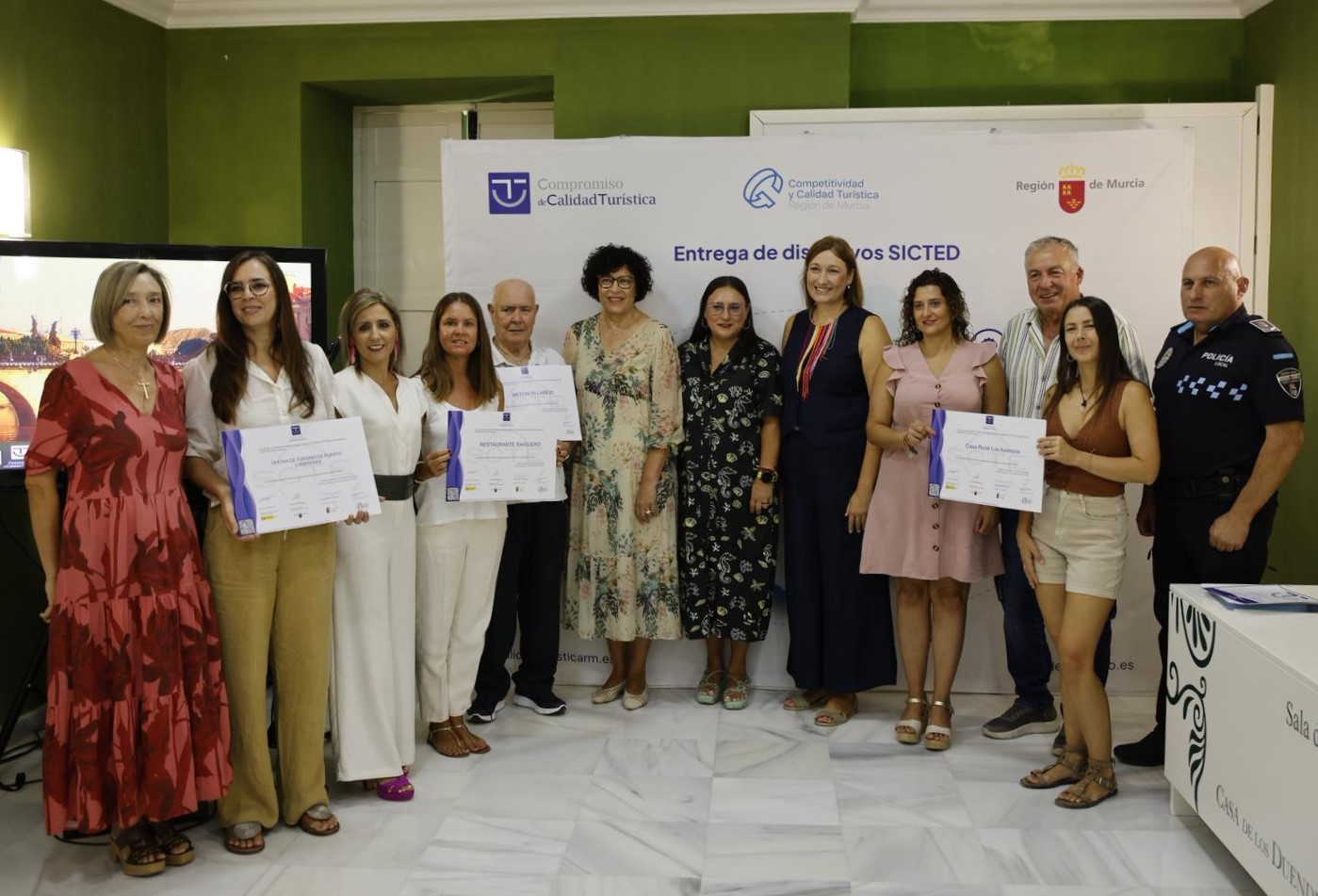 La directora general de Competitividad y Calidad Turísticas, Eva Reverte, y la alcaldesa de Puerto Lumbreras, María Ángeles Túnez, con los representantes de las entidades acreditadas