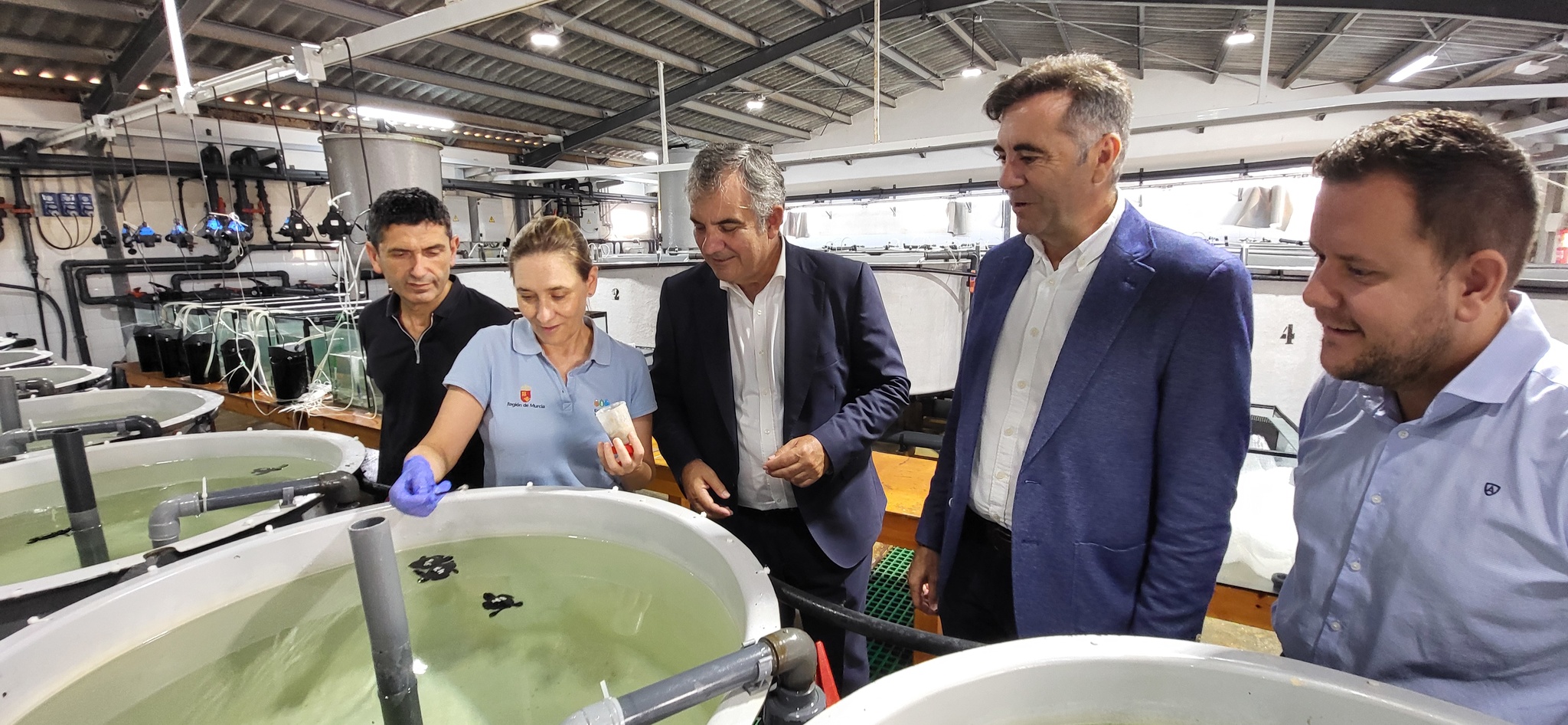 El consejero de Medio Ambiente, Universidades, Investigación y Mar Menor, Juan María Vázquez, junto con el alcalde de San Pedro del Pinatar, Pedro Javier Sánchez, visitan la instalación del IMIDA donde ya se encuentran los 47 ejemplares de tortuga boba que se suman al programa headstarting
