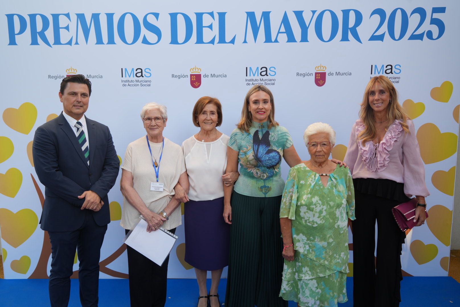 La consejera de Política Social, Familias e Igualdad, Conchita Ruiz, y el alcalde de San Javier, José Miguel Luengo, junto a las personas reconocidas con los 'Premios del Mayor 2025