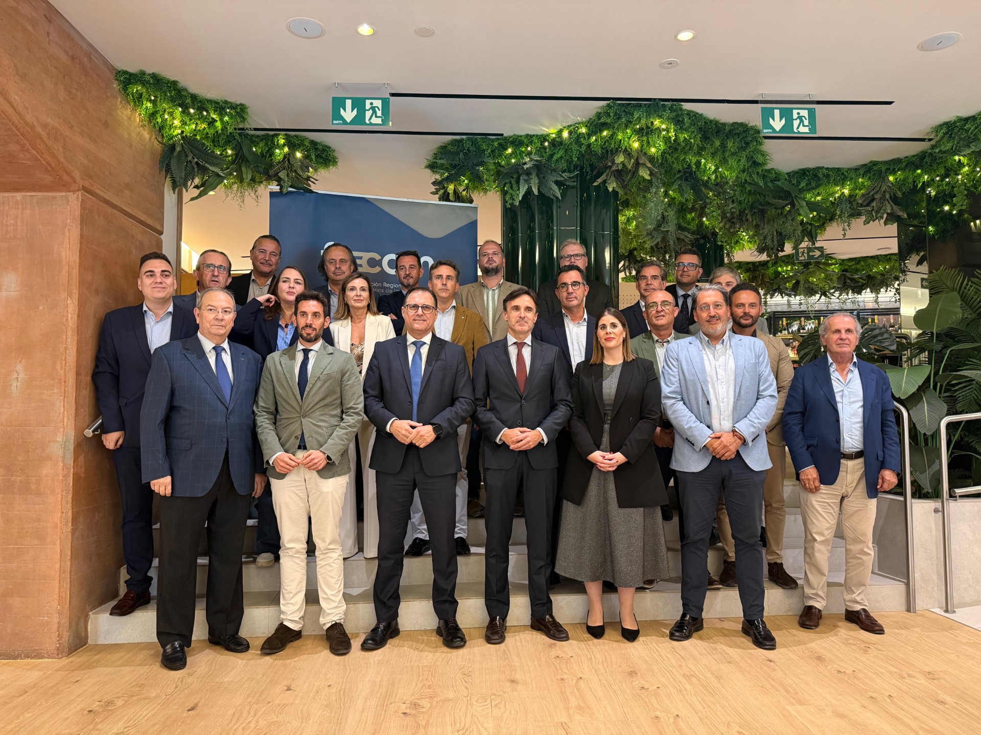 El consejero de Fomento e Infraestructuras, Jorge García Montoro, acompañado del presidente de FRECOM, José Hernández, parte del equipo directivo de la Consejería y asociados de FRECOM, durante el foro ‘Protagonistas FRECOM’