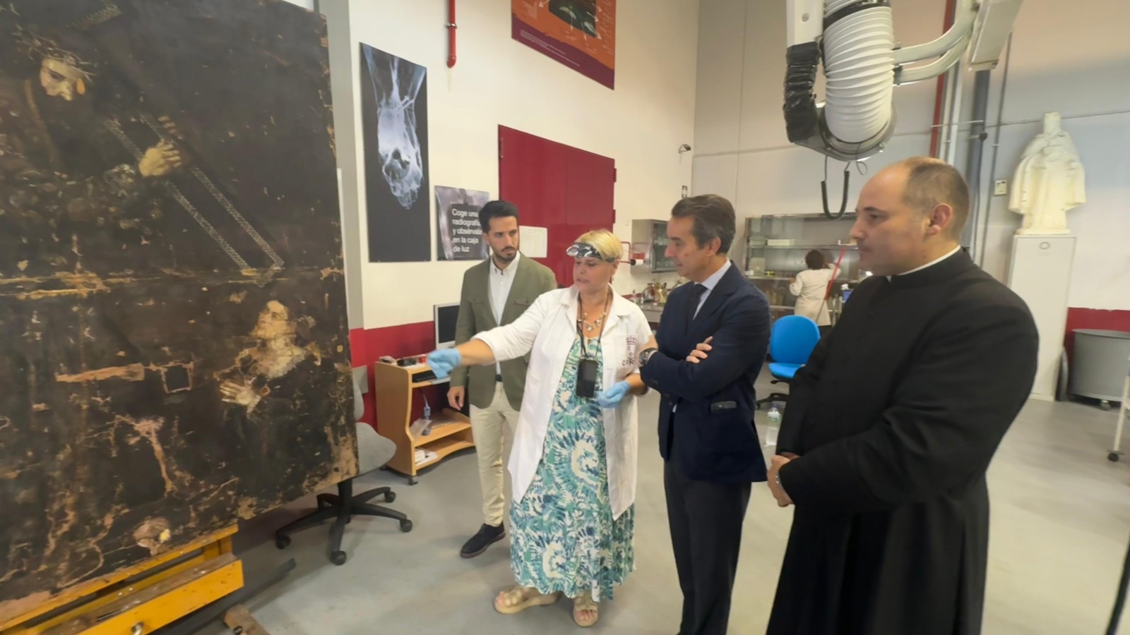Visita a los trabajos de restauración del lienzo de finales del XVII de Nuestro Padre Jesús Nazareno por el director general de Patrimonio Cultural, Patricio Sánchez, y el presidente de la Cofradía, Emilio Llamas.