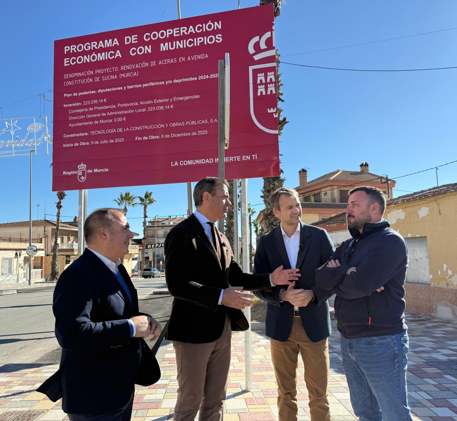 El consejero de Presidencia, Portavocía, Acción Exterior y Emergencias, Marcos Ortuño, y el director general de Administración Local, Francisco Abril, junto con el concejal de Pedanías y Vertebración Territorial del Ayuntamiento de Murcia, Marco Antonio Fernández, y el alcalde pedáneo de Sucina, David García, durante la visita realizada hoy a Sucina.