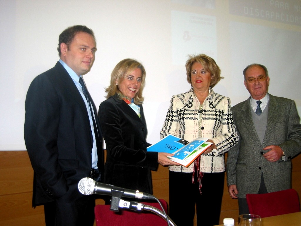 La consejera de Trabajo y Política Social, Cristina Rubio, junto a la directora de Familia y Servicios Sectoriales, Marisol Morente, el director gerente de FUNDOWN, Pedro Martínez, a la izquierda, y el presidente de la Federación de Asociaciones de Discapacitados Psíquicos, Mariano Manzanares, en la presentación del Manual de Prevención y Detección del Maltrato para Mujeres con Discapacidad Psíquica.