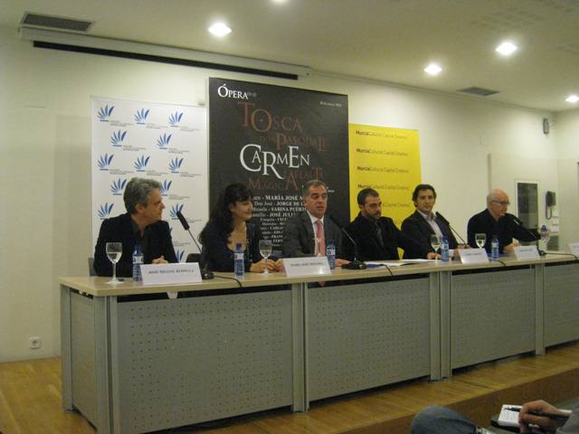 El director del Auditorio y Centro de Congresos Víctor Villegas, Antonio Contreras, acompañado por el director artístico del ciclo, Curro Carreres, presentó hoy a los actores protagonistas de la ópera 'Carmen' de Georges Bizet, María José Montiel, y Jorge de León. La obra se representará en el Auditorio el 30 de enero a las 20.00 horas, con producción de la Fundación Teatro Villamaría de Jerez y dirección escénica de Francisco López, y bajo la dirección musical de la Orquesta Sinfónica de la Región de Murcia, la cual preside José Miguel Rodilla.