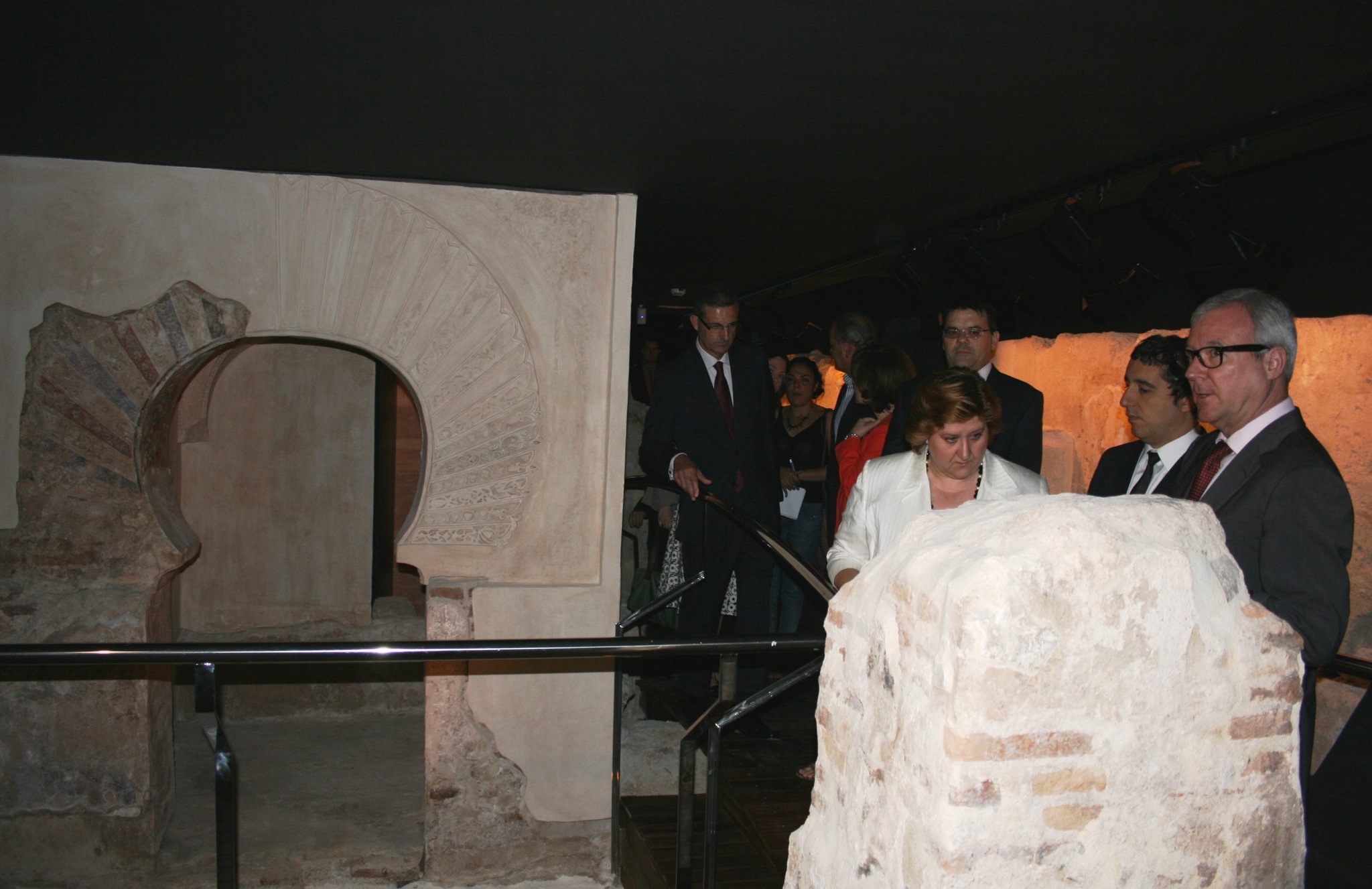 El presidente de la Comunidad, Ramón Luis Valcárcel, inauguró hoy el Conjunto Monumental de San Juan de Dios que incluye la Iglesia, los restos del Alcazar Musulmán de Murcia y una exposición permanente de la obra del escultor murciano de González Moreno. En la imagen, el jefe del Ejecutivo murciano junto al consejero de Cultura y Turismo, pedro Alberto Cruz, la consejera de Economía y Hacienda, Inmaculada García, durante el recorrido por las distintas instalaciones museísticas.