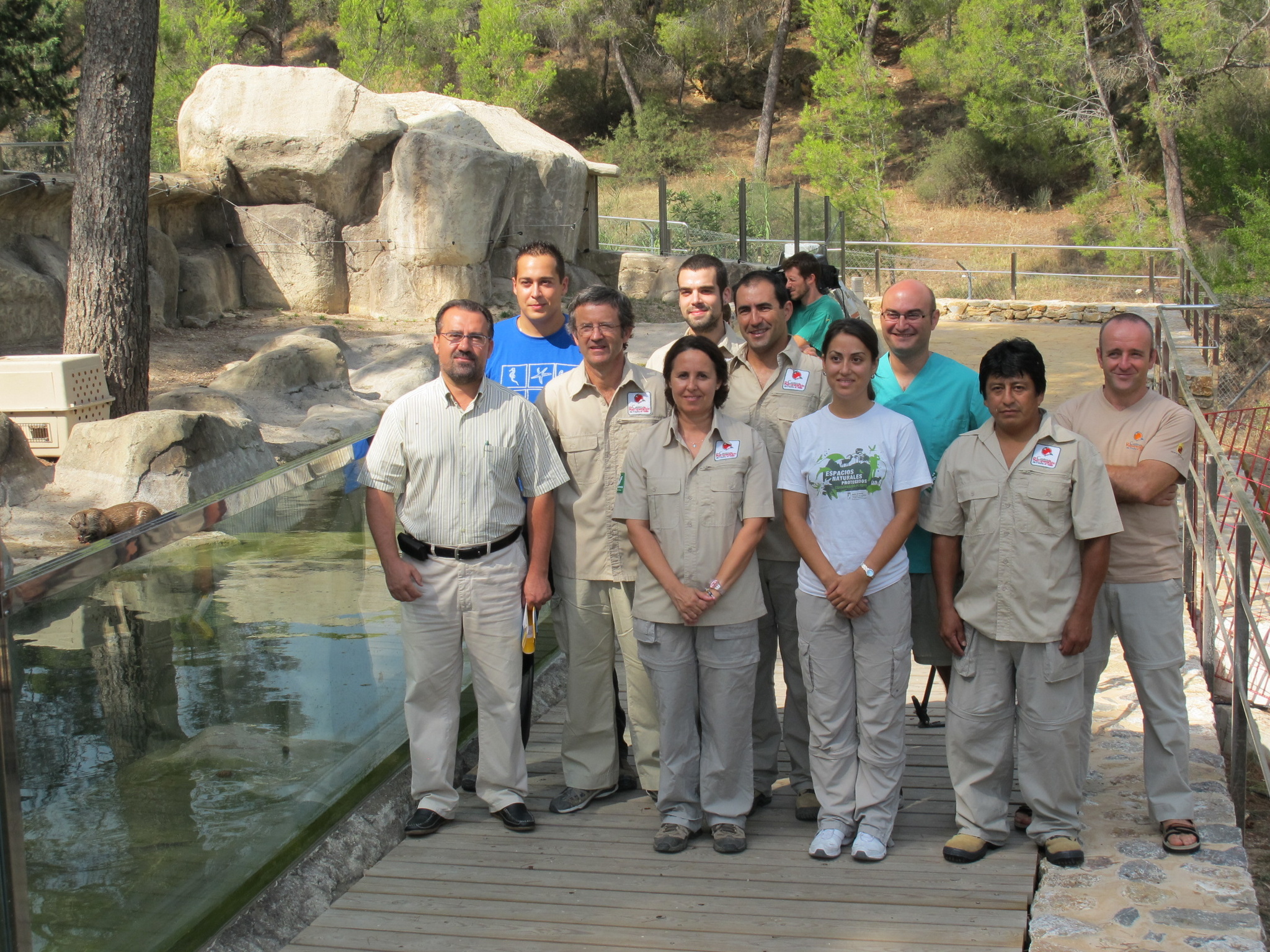 El director general de Patrimonio Natural Y Biodiversidad, Pablo Fernández, 1i, y los técnicos del Centro de Recuperación, posan junto al hábitat adecuado para la nutria ibérica.
