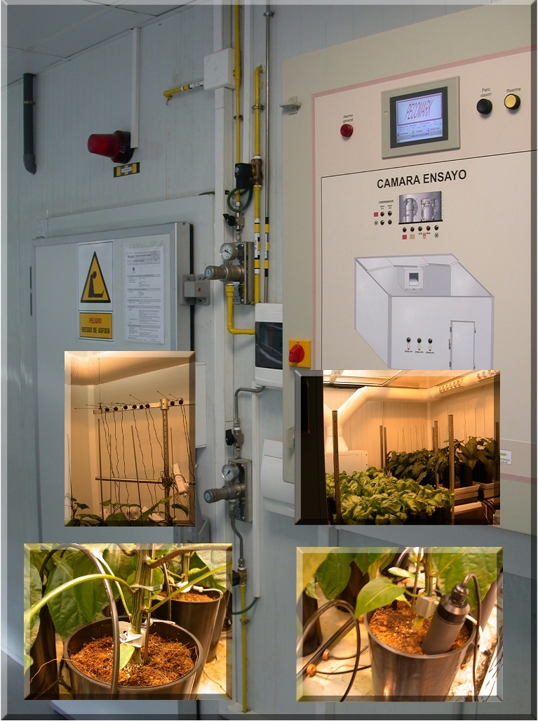 La imagen muestra la cámara donde se realizan los ensayos con diferentes tipos de plantas.