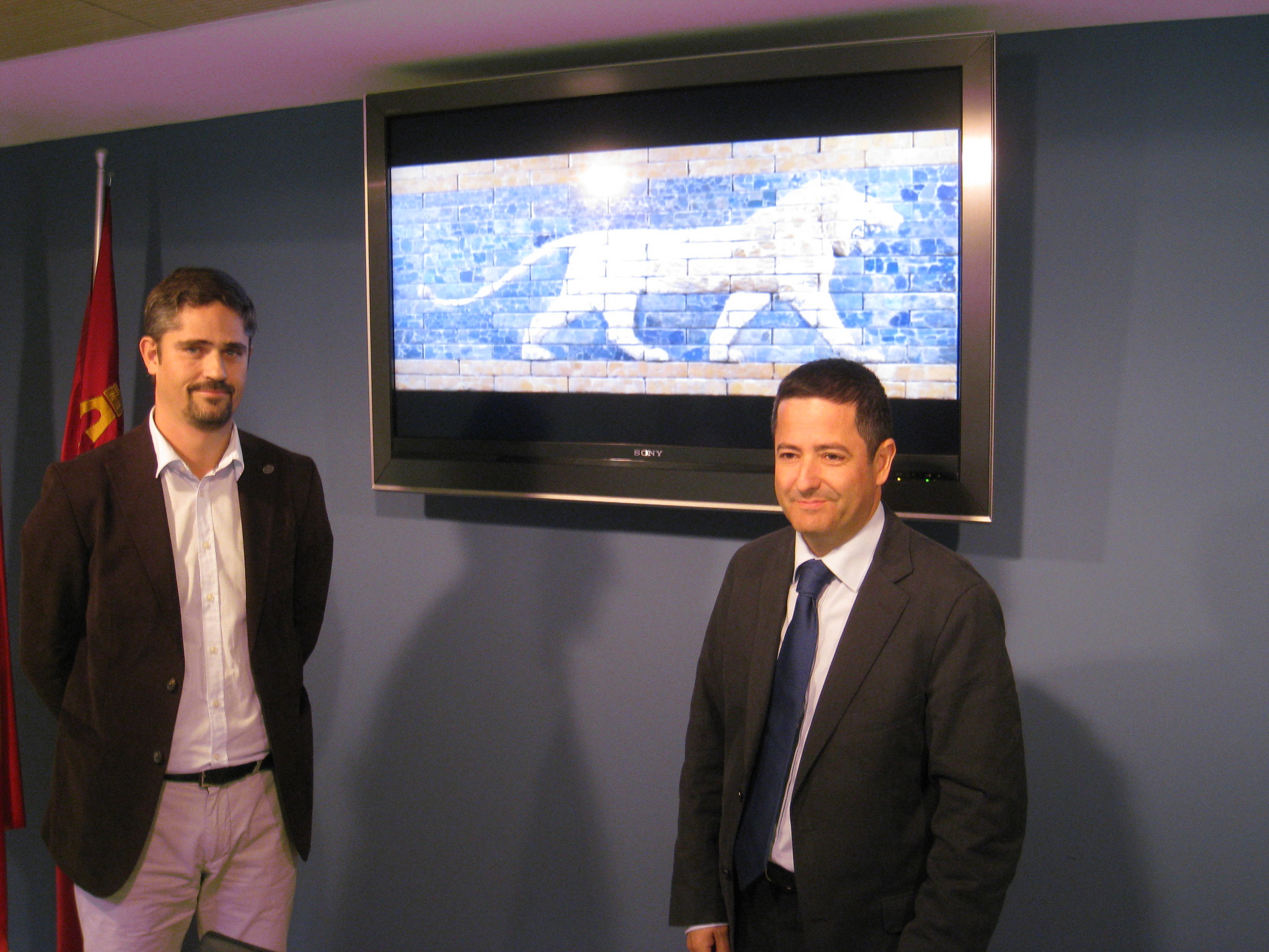 El director general de Bellas Artes y Bienes Culturales, Enrique Ujaldón (d), junto al comisario de la exposición 'Torre de Babel: Historia y mito’, Juan Luis Montero (i).