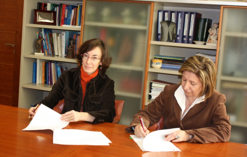 La consejera de Sanidad y Consumo, María Ángeles Palacios, junto con la directora de la Fundación Antena 3, Carmen Bieger, durante la firma del convenio que posibilita la difusión de contenidos del Canal FAN 3 en los centros hospitalarios de la Región.