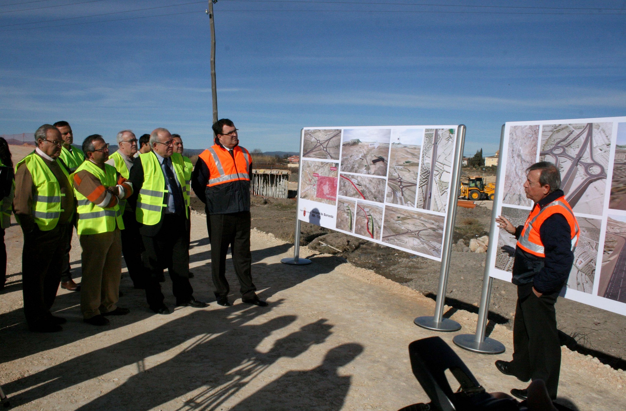 El consejero de Obras Públicas y Ordenación del Territorio, José Ballesta, junto al alcalde de Caravaca de la Cruz, Domingo Aranda, recibe las explicaciones de la situación de la obra de la variante de Barranda de parte del director general de Carreteras, José Guijarro.