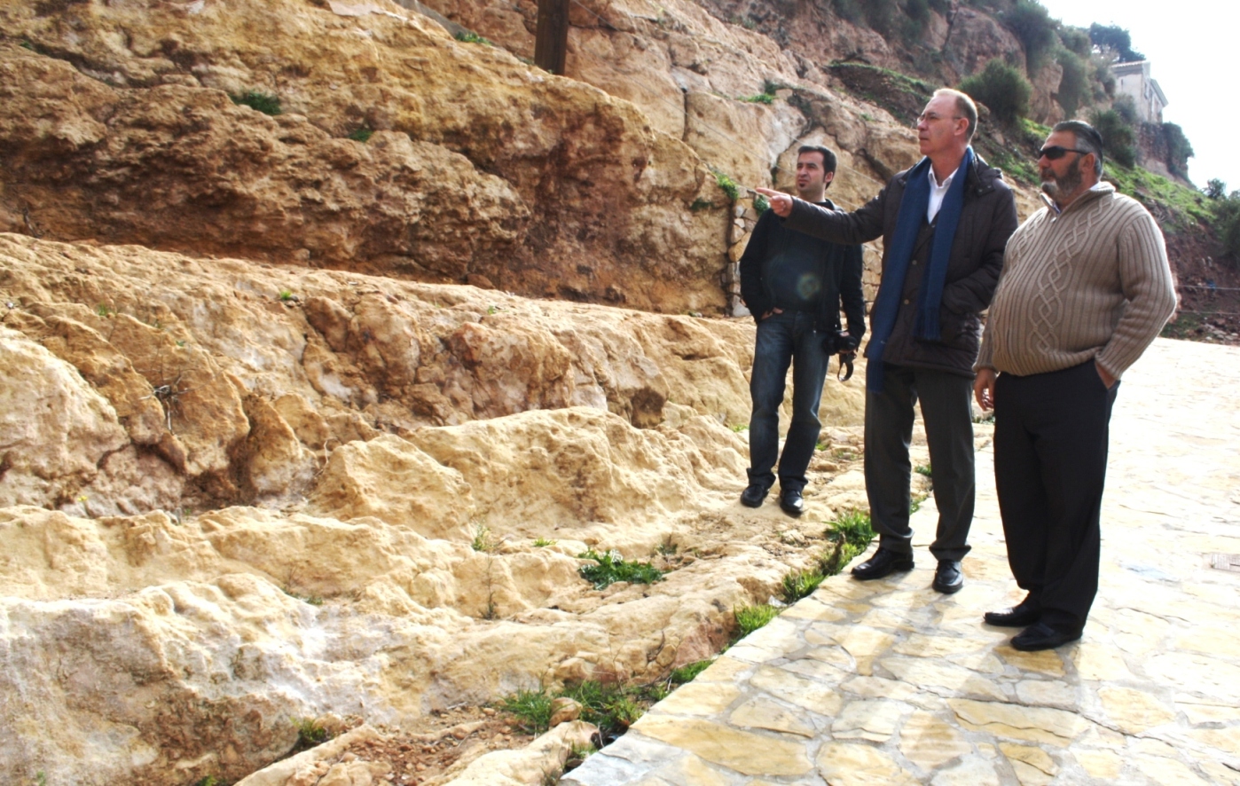 El director general de Territorio y Vivienda, Antonio Navarro (1d), acompañado del alcalde de Aledo, Simón Alcaraz, y el técnico encargado del proyecto, Francisco Javier Andreo, visita el paraje de ‘Las Cuestas’, donde el Gobierno regional ha financiado las obras de revitalización y mejora del paisaje.