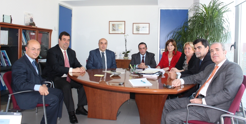 El director de Régimen Económico del Servicio Murciano de Salud, Andrés Carrillo (1i), junto al doctor doctor Fernando Mesa del Castillo, presidente de la Unión Murciana de Hospitales (2i); el director gerente del SMS, José Antonio Alarcón (3i); el director gerente del Hospital Viamed San José, Diego Cazorla (c); la secretaria de la Unión Murciana de Hospitales, Susana Casado (4d); la directora gerente del Hospital Virgen del Alcázar, María Dolores Lafuente (3d); el jefe de Servicio de Aseguramiento y Prestaciones, José María Ortega (2d) y el director gerente del Hospital del Perpetuo Socorro, José Hernández (1d).