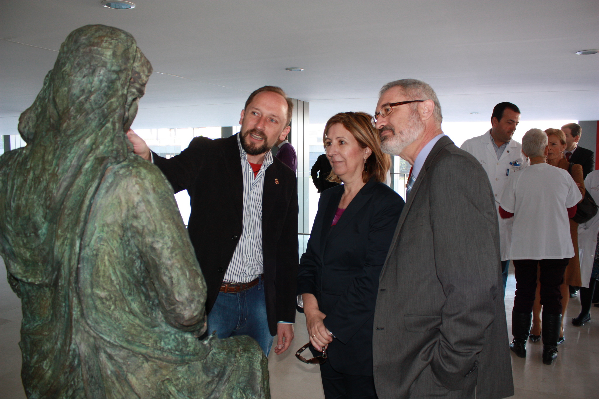 La consejera de Sanidad y Consumo, María Ángeles Palacios, junto a la escultura ‘La Maternidad’, durante su visita al Centro de Bioquímica y Genética Clínica. En la imagen, Palacios (c), junto al director gerente del Área de Salud I Murcia-Oeste, Manuel Alcaraz (d), y el escultor Juan José Quirós (i).