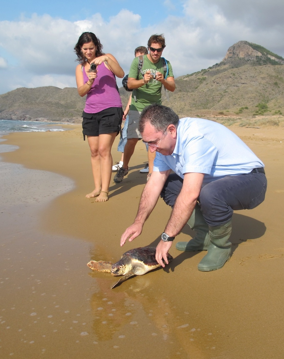 El consejero de Presidencia, Manuel Campos, liberó a dos ejemplares de tortuga boba que han sido tratadas en el Centro de Recuperación de Fauna Silvestre 'El Valle'. Una de ellas, la que aparece en la imagen, fue hallada en la playa de Cabo de Palos, atrapado en el interior de una bolsa de rafia con síntomas de desnutrición, deshidratación y agotamiento.