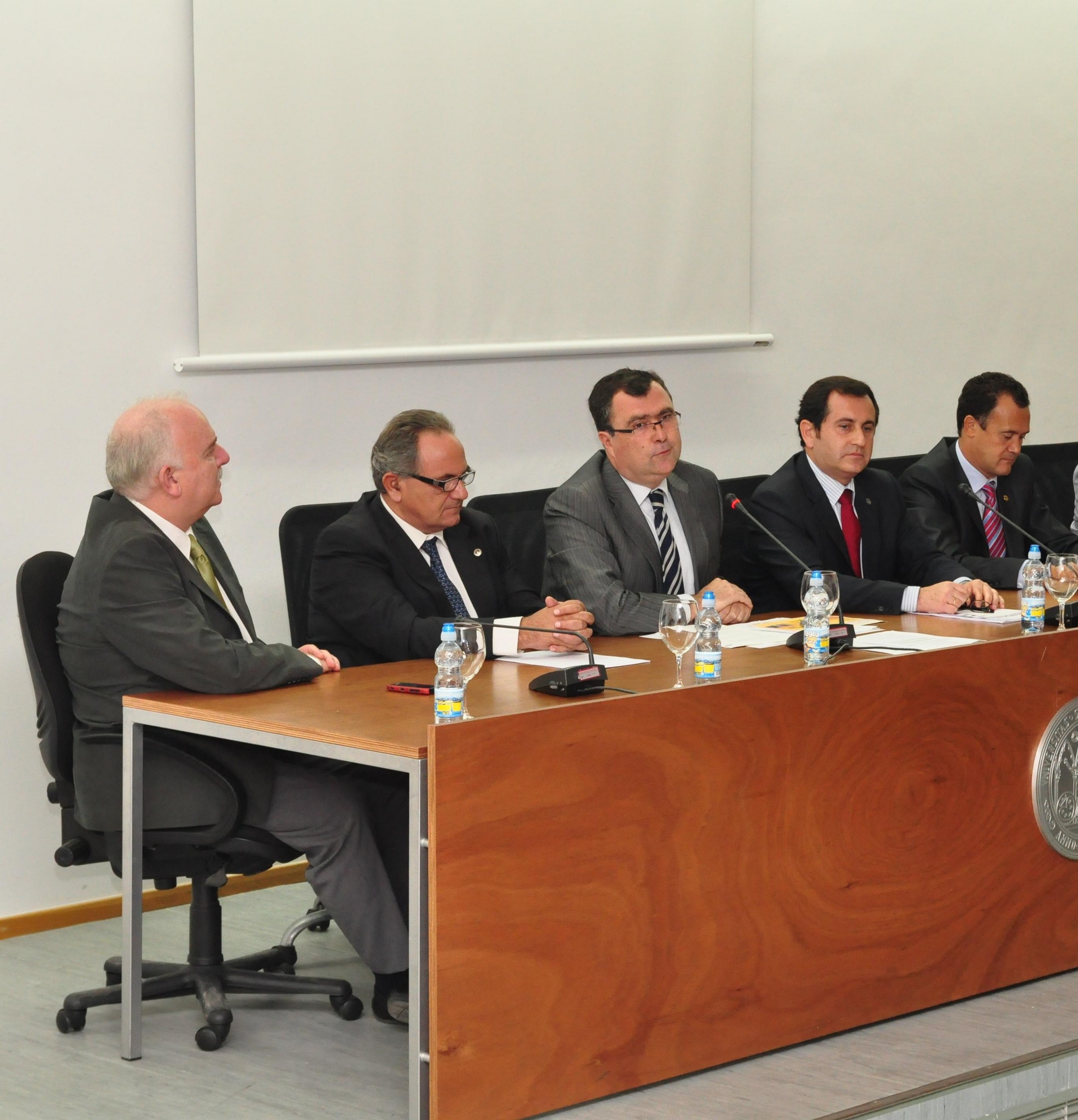 El consejero de Universidades, Empresas e Investigación, José Ballesta(c) , junto al vicerrector de Relaciones Internacionales y de Investigación de la Universidad de Murcia, Gaspar Ros (3d), el decano de la Facultad de Veterinaria, Antonio Rouco (2i), el decano de la Facultad de Medicina y Odontología de la Universidad de Valencia, Antonio Pellicer (2d),el decano de la Facultad de Medicina de la UMU, Joaquín María García- Estañ (1i) y el coordinador del Máster, Manuel Avilés (1d).