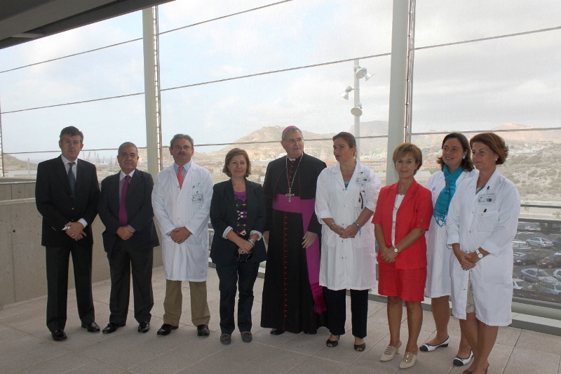 La consejera de Sanidad y Política Social, María Ángeles Palacios (c); junto al director gerente del Área de Salud II Cartagena, Manuel Ángel Moreno (1i), y el profesionales del Hospital General Universitario Santa Lucía de Cartagena que acompañaron al obispo de la Diócesis de Cartagena, José Manuel Lorca Planes (1d), durante su visita al centro hospitalario.
