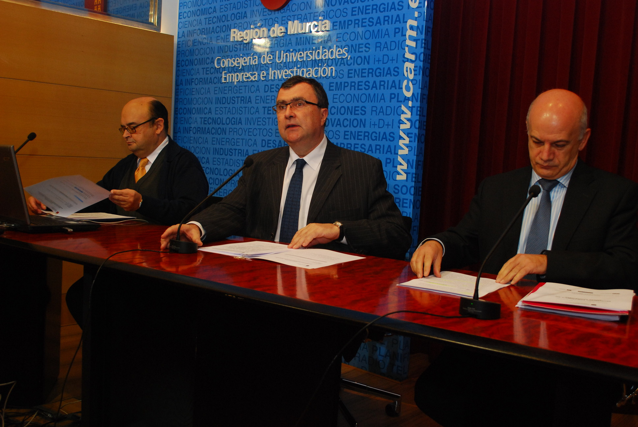 El consejero de Universidades, Empresa e Investigación, José Ballesta, durante la inauguración de las jornadas de presentación del proyecto 'Modelación hidrológica en zonas semiáridas'. Le acompañan el director general de Universidades y Política Científica, Eduardo Osuna (1d), y el director de la Fundación Instituto Euromediterráneo del Agua, Francisco Cabezas (1i).