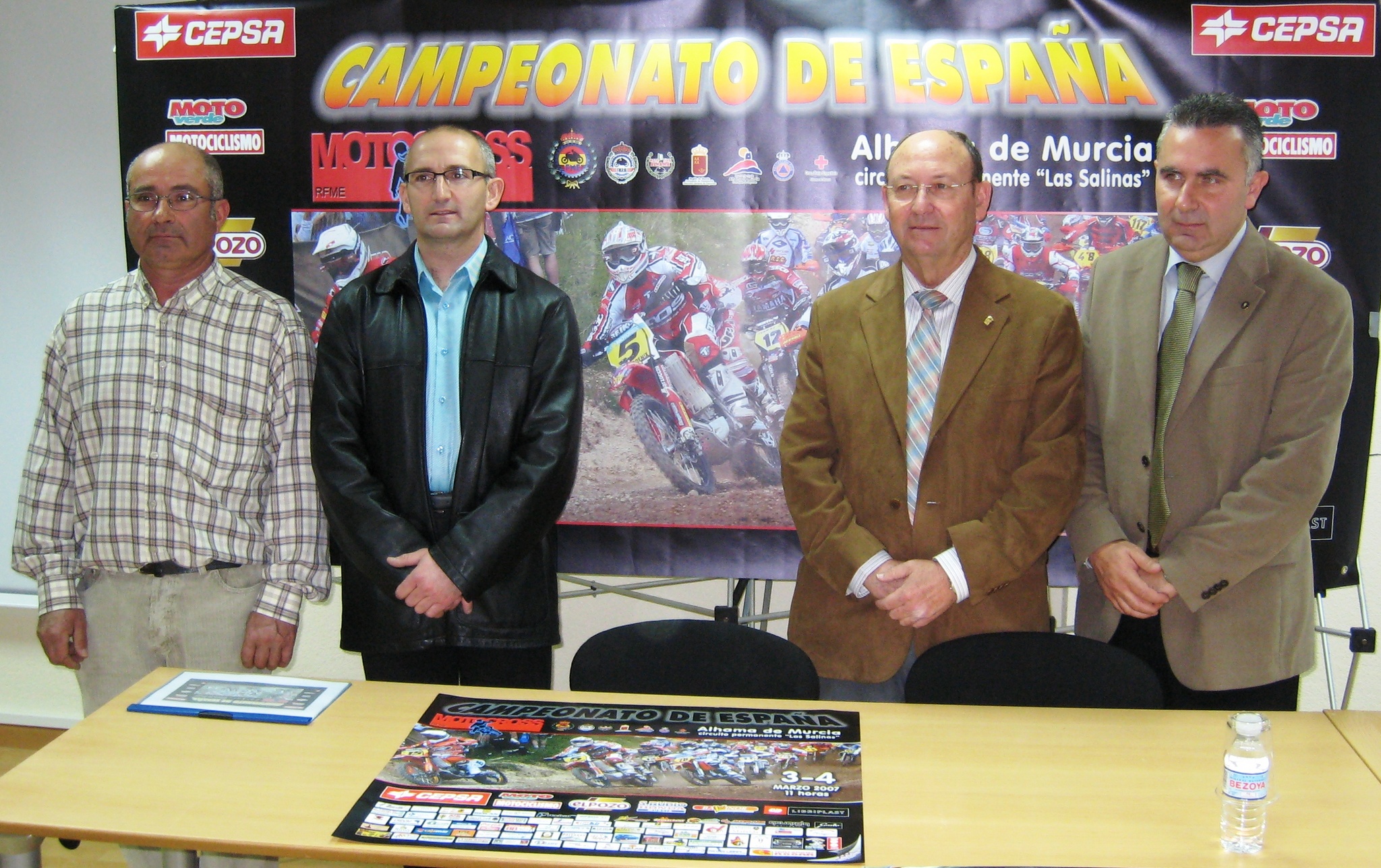 El presidente del Moto Club Alhama de Murcia, José García Serrano, el presidente de la Federación de Motociclismo de la Región de Murcia, José Miguel Martínez-Mena, el alcalde de Alhama, Juan Romero, y el director general de Deportes, Juan Antonio Morales, durante la presentación del Motocross de Alhama de Murcia, puntuable para el Campeonato de España de la especialidad.