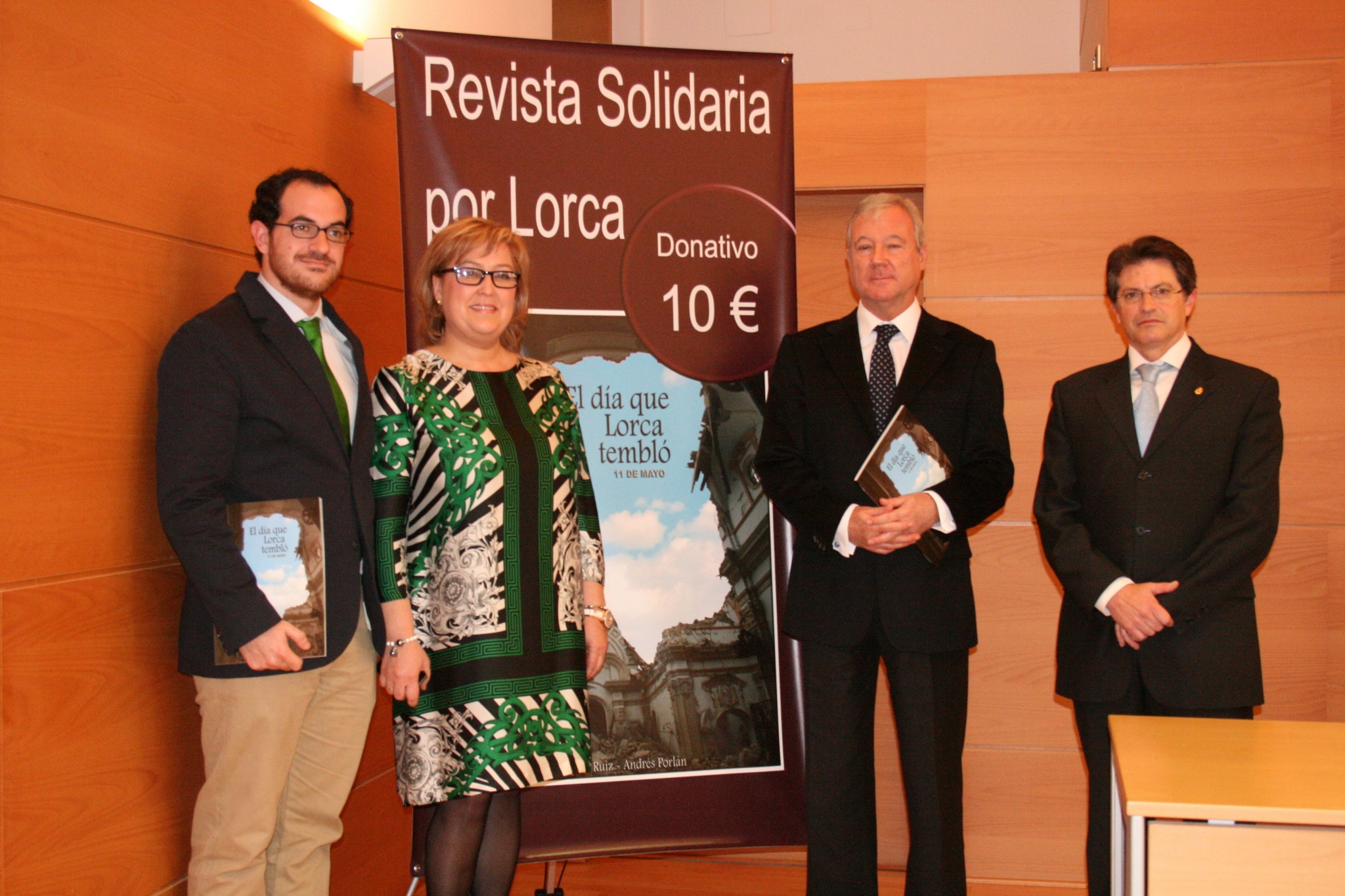 El presidente de la Comunidad Autónoma, Ramón Luis Valcárcel, acompañado por el alcalde de Lorca, Francisco Jódar, presentó hoy en el Palacio de San Esteban la revista 'El día que Lorca tembló', publicación solidaria editada por el Ayuntamiento. Ambos estuvieron acompañados en el acto por la fotógrafa María José Ruiz, autora de la mayoría de las imágenes de la revista, y del escritor Andrés Porlán, autor de los textos.