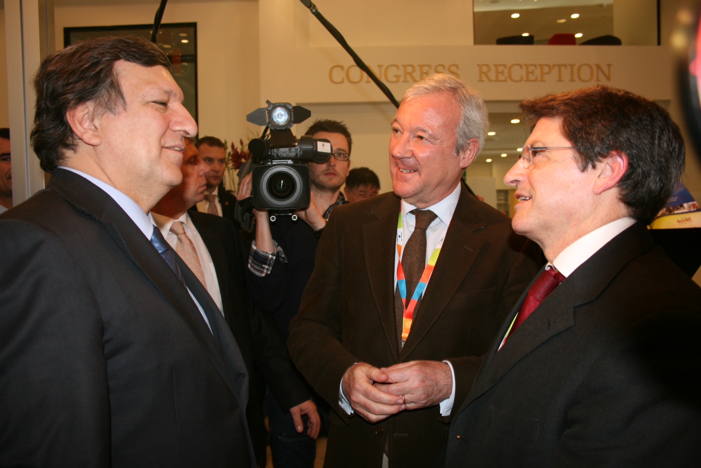 El presidente de la Comisión Europea, José Manuel Durao Barroso, visita el stand de Murcia en la Cumbre de Copenhague y muestra al alcalde de Lorca, Francisco Jódar, y al presidente de la Comunidad, Ramón Luis Valcárcel, su interés por visitar la ciudad.
