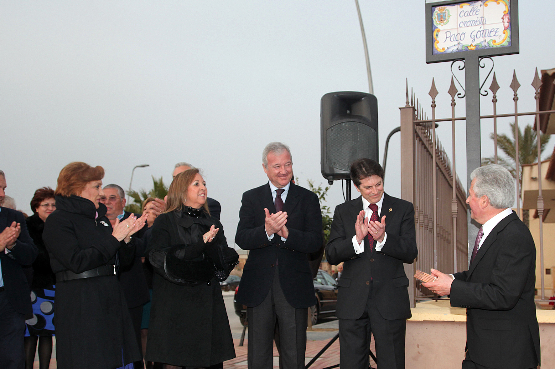 Valcárcel, acompañado del alcalde de Lorca, Francisco Jódar, presidió el acto de descubrimiento de la placa con la que se da el nombre del periodista Francisco Gómez, primer pregonero de la Semana Santa de La Hoya, a una calle de la pedanía.