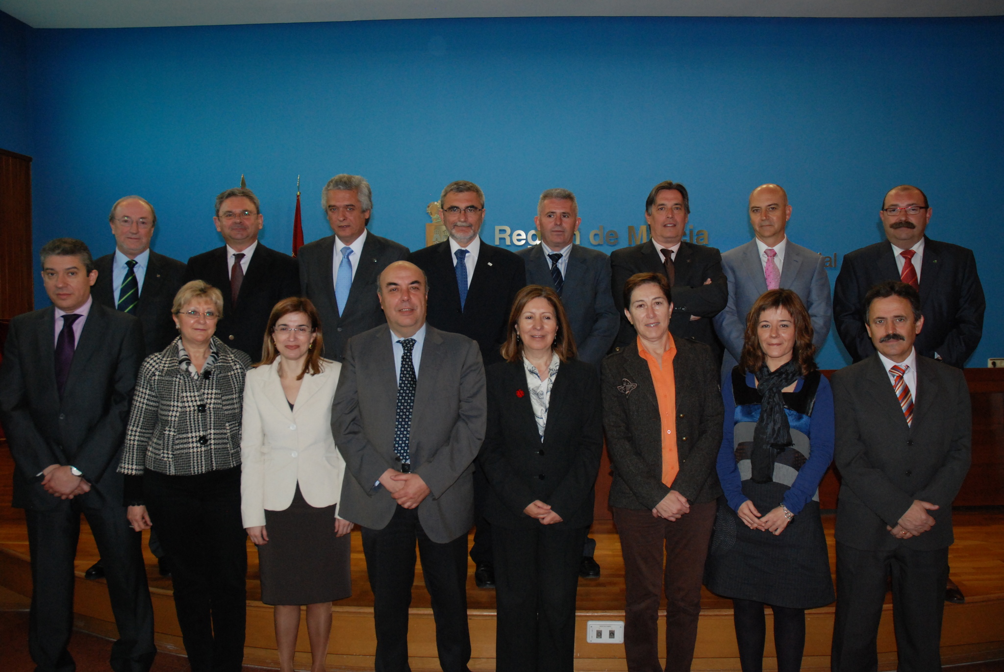 En la primera fila, la consejera de Sanidad y Política Social, María Ángeles Palacios (c), junto al director gerente del Servicio Murciano de Salud (SMS), José Antonio Alarcón; el director general de Recursos Humanos del SMS, Luis Martínez Atienza (1i); la directora general de Asistencia Sanitaria del SMS, Magina Blázquez (2i); la directora gerente del Área de Salud-VIII, Mari Paz García (3i); la directora gerente del Área de Salud III-Lorca, Catalina Lorenzo (3d); directora Médica del Hospital Psiquiátrico Román Alberca, María Asunción de Concepción Salesa (2d); y el director gerente de Área de Salud IV-Noroeste, Pedro Pozo (1d). En la segunda fila, de izquierda a derecha, el director gerente del Área de Salud V-Altiplano, Luis Joaquín González-Moro; el director gerente del Área de Salud II-Cartagena, Manuel Ángel Moreno; el director de la Gerencia de Emergencias 061 de la Región de Murcia, Francisco Celdrán; el director gerente del Área de Salud VI-Vega Media del Segura, Tomás Fernández; el secretario general de la Consejería de Sanidad y Política Social, Martín Quiñonero; el director gerente del Área de Salud I-Murcia Oeste, José Vicente Albaladejo; el director gerente del Área de Salud VII-Murcia Este, José María Cerezo; y el director gerente del Área de Salud IX-Vega Alta del Segura, Andrés Soto.