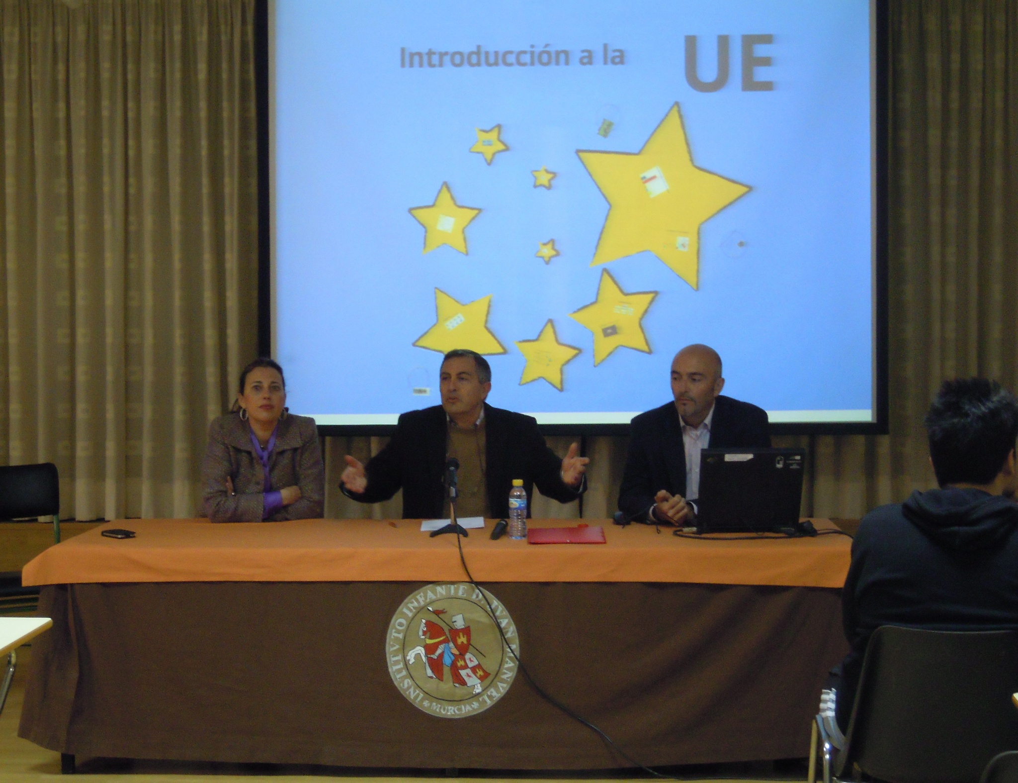 La directora general de la Unión Europea y Relaciones Exteriores, Carmen Sandoval, junto al funcionario murciano de la Oficina de Armonización del Mercado Interior (OAMI), José Francisco Crespo, durante la actividad formativa realizada en el instituto Infante Don Juan Manuel, en el marco del programa 'Back to School', de la Comisión Europea